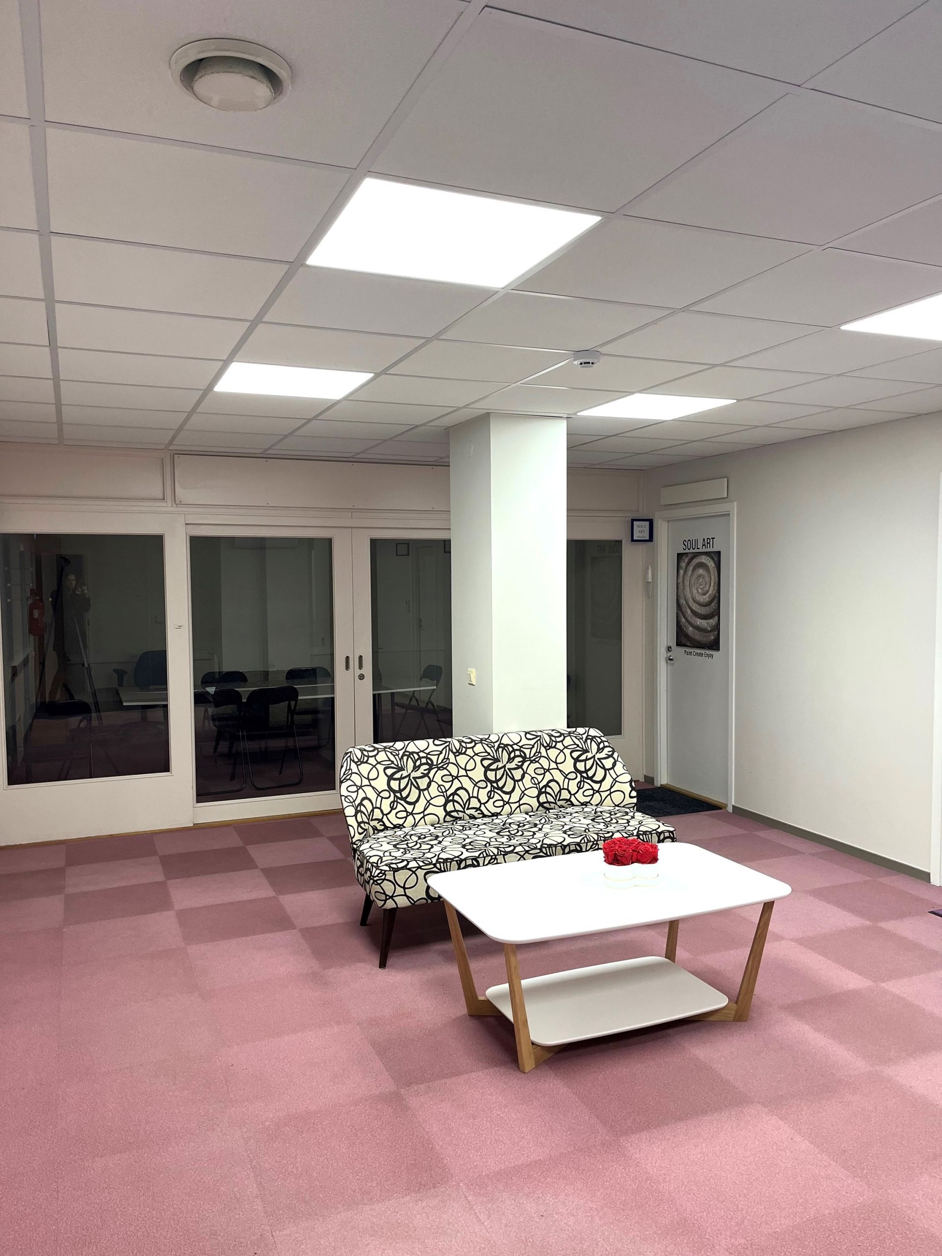 2 aknaga, põrandal pvc kate, seinad värvitud, osa seinast on riputatavate stendide, esemete või piltide jaoks sobiv.