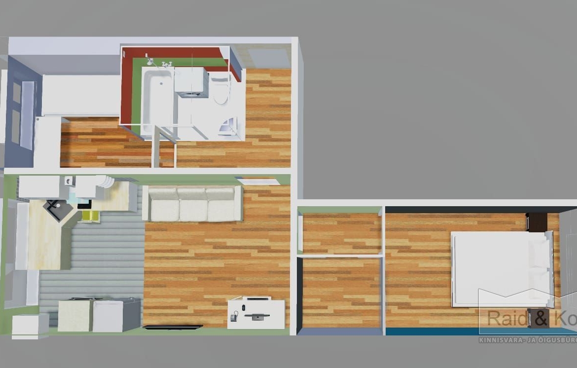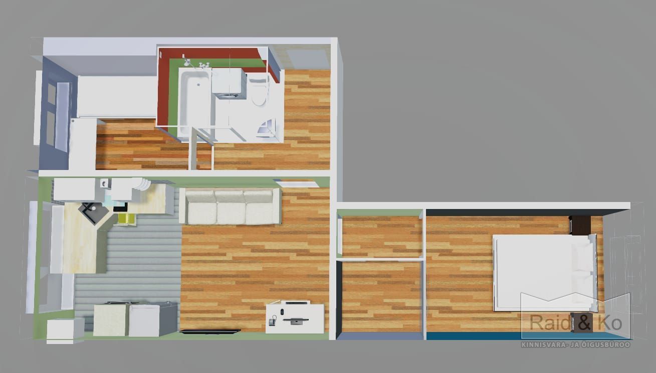 Korter paikneb 5-korruselise korterelamu teisel korrusel. Korteri planeeringut on muudetud nii, et köök viidi elutuppa ning lisandus üks magamistuba (EHR-is abiruumina). Ümberplaneering on seadustatud.