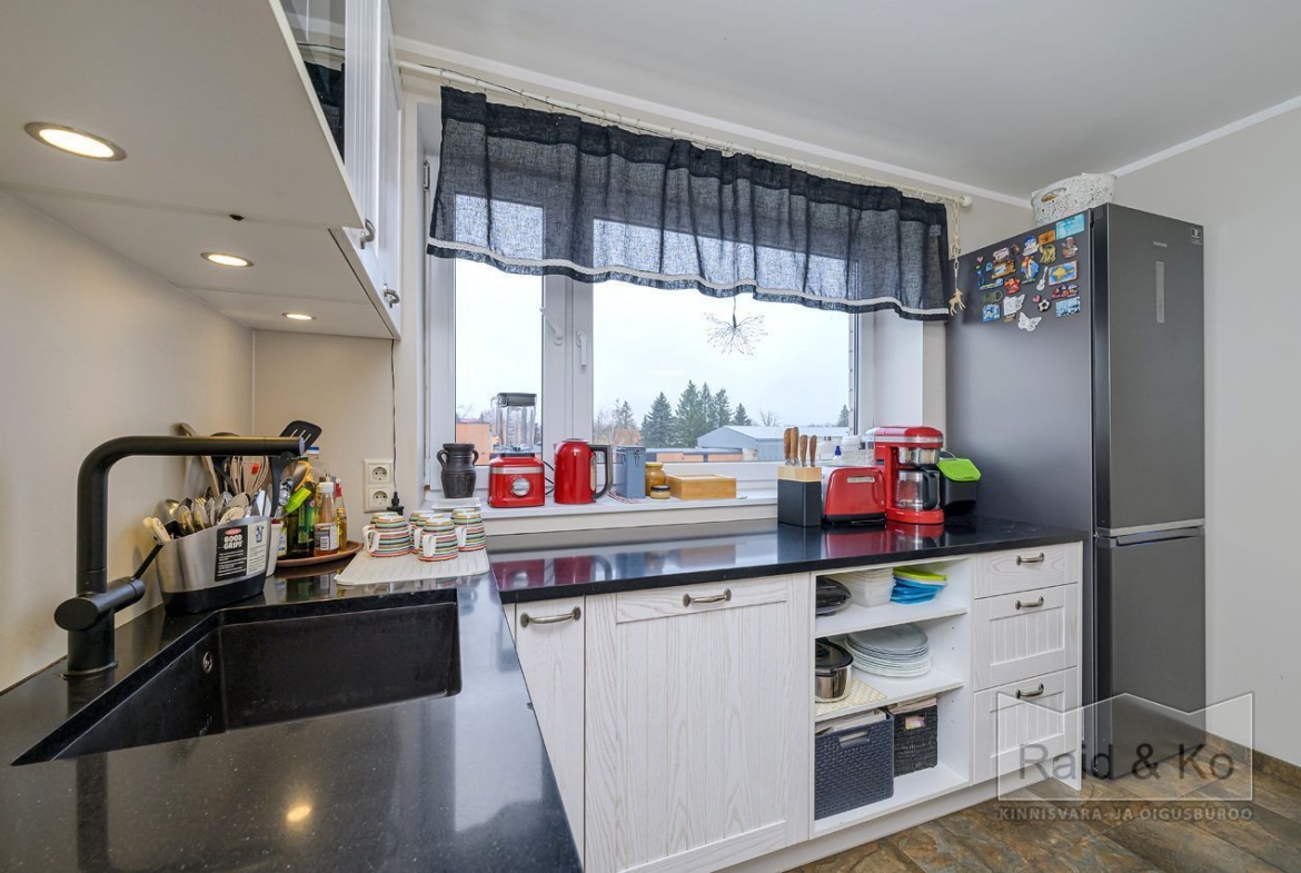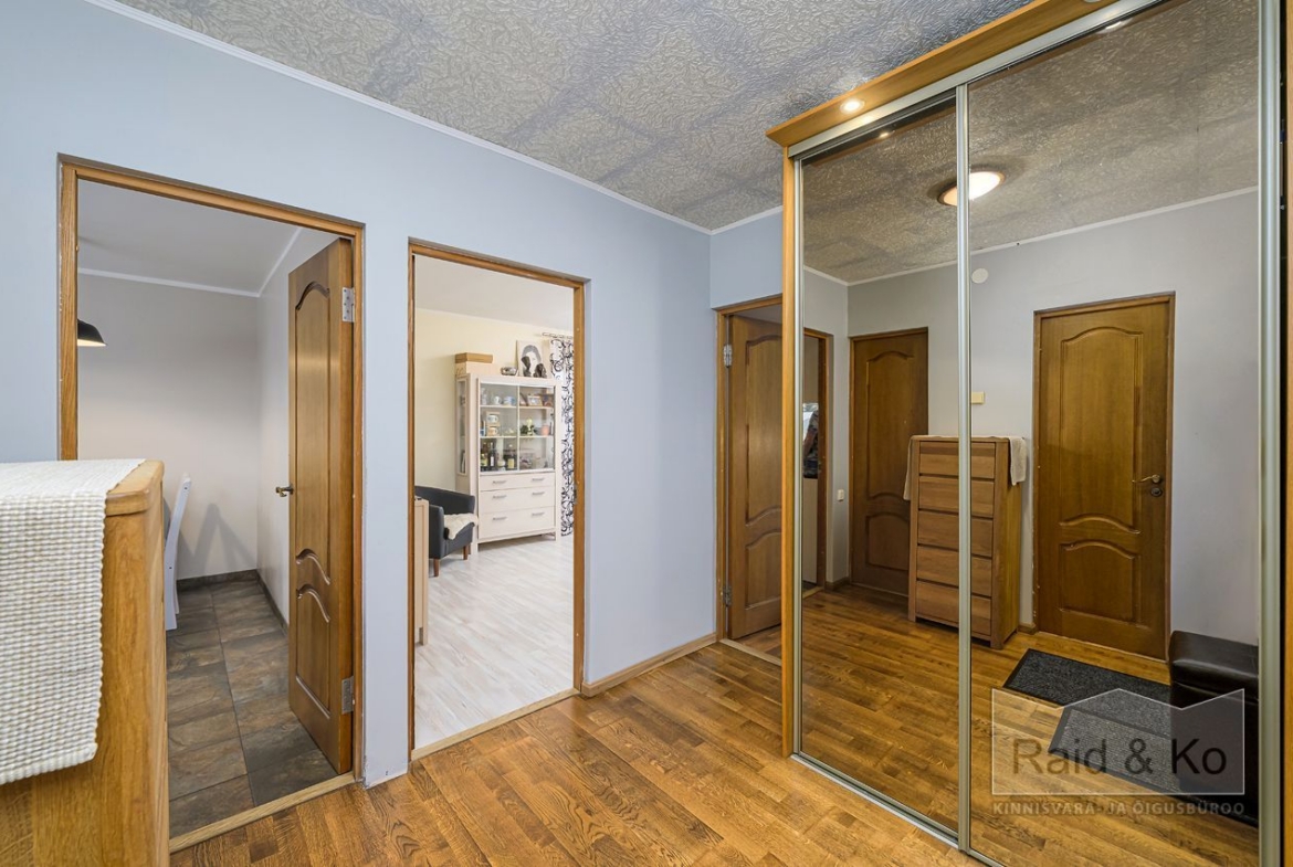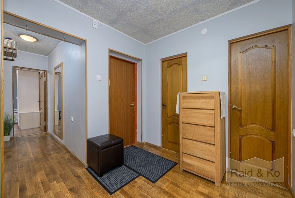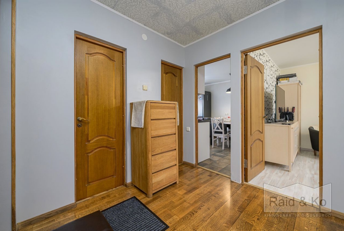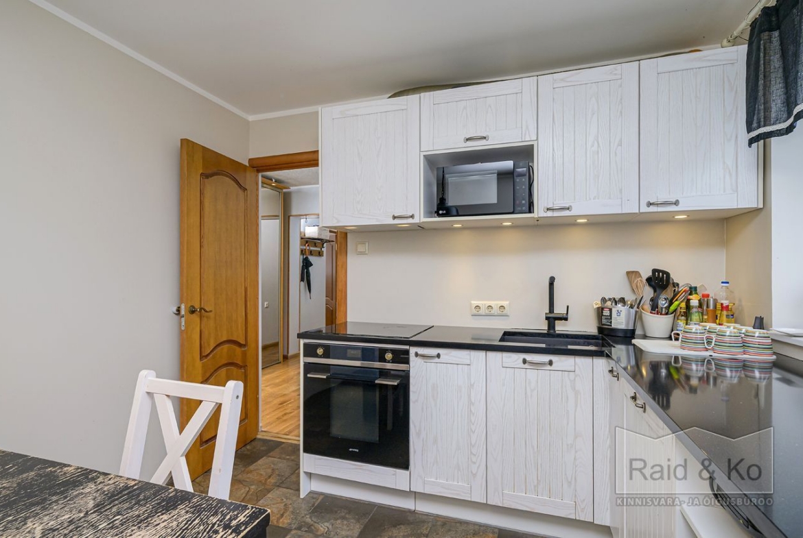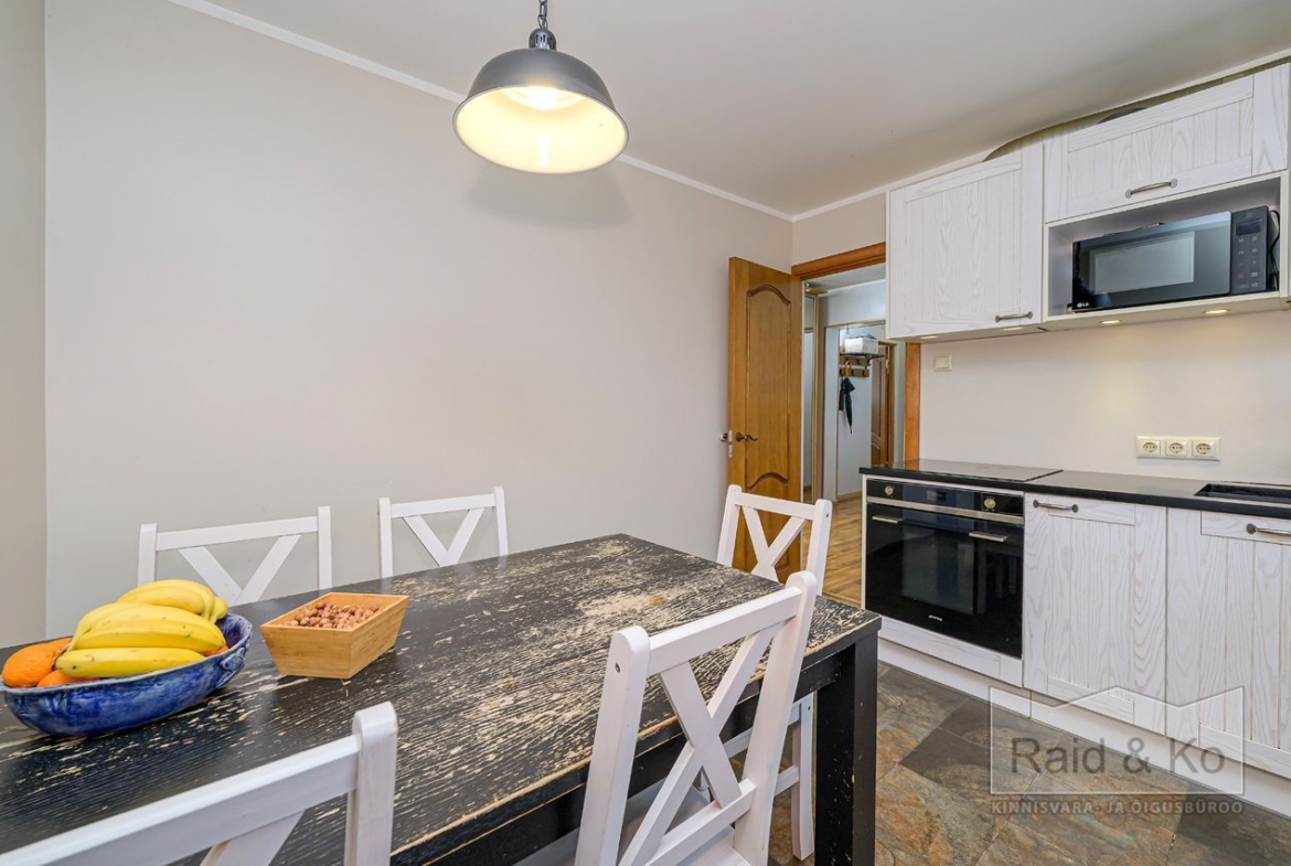 Korteris on suur esik ja köök. Köögimööbel koos sisseehitatud tehnikaga jääb sisse. Köögi tasapinnaks on graniit. Samuti jääb sisse esiku kapp ja suure magamistoa kogu tume puitmööbel.