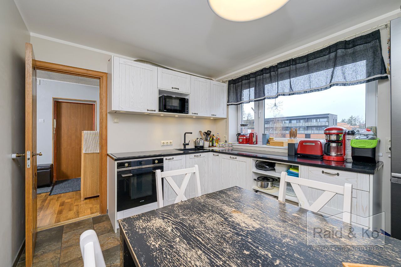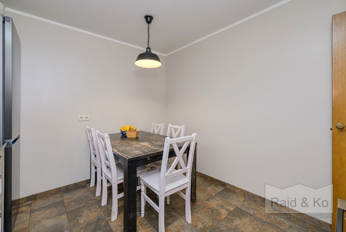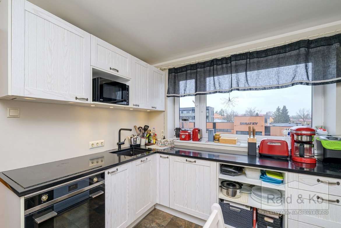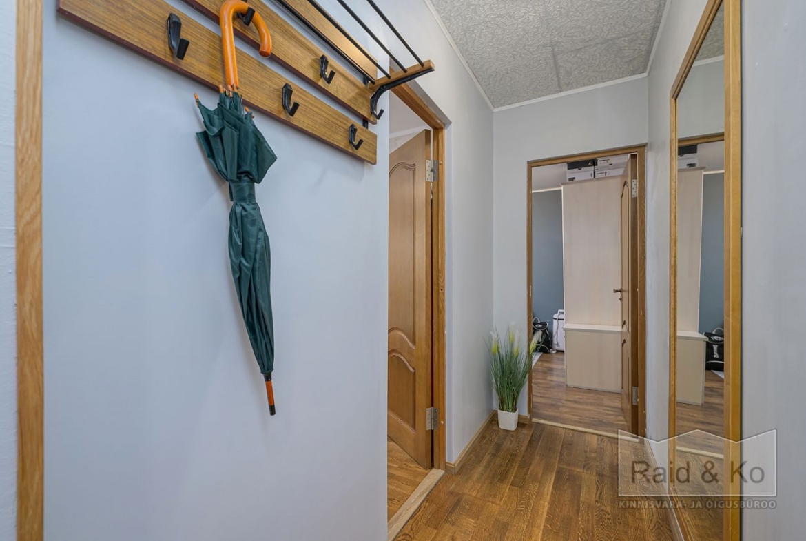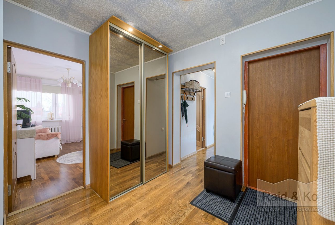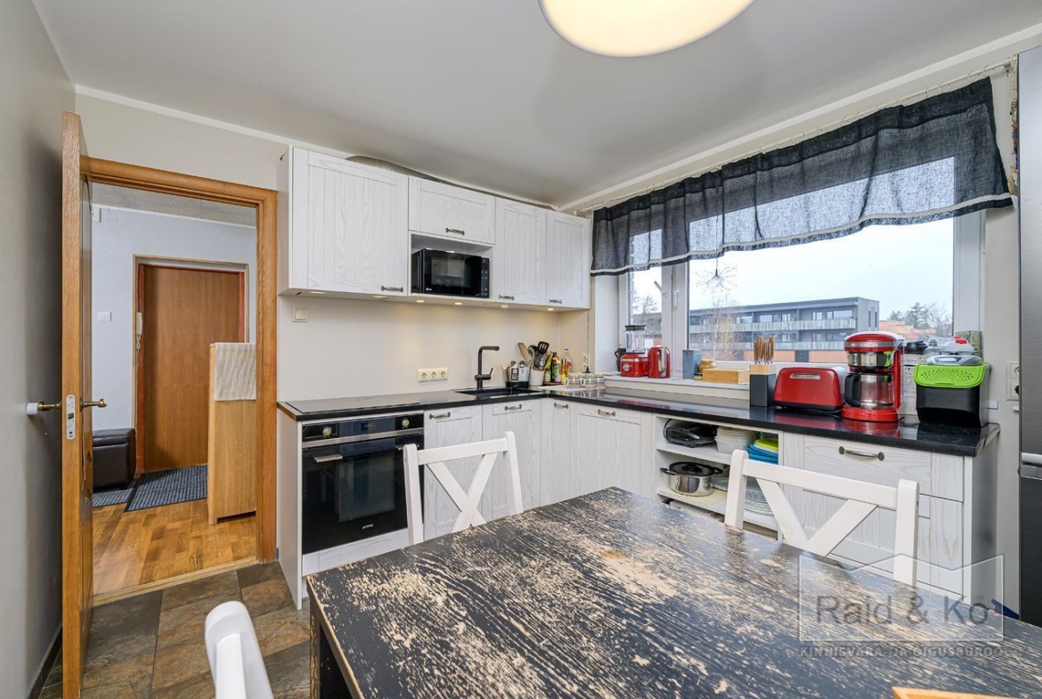 Korteris on suur esik ja köök. Köögimööbel koos sisseehitatud tehnikaga jääb sisse. Köögi tasapinnaks on graniit. Samuti jääb sisse esiku kapp ja suure magamistoa kogu tume puitmööbel.