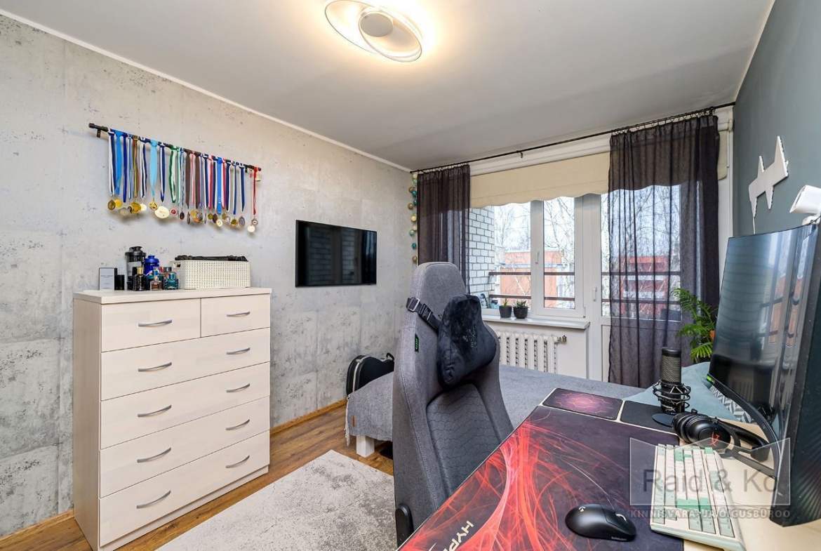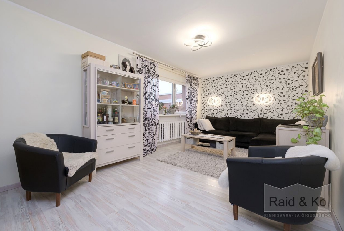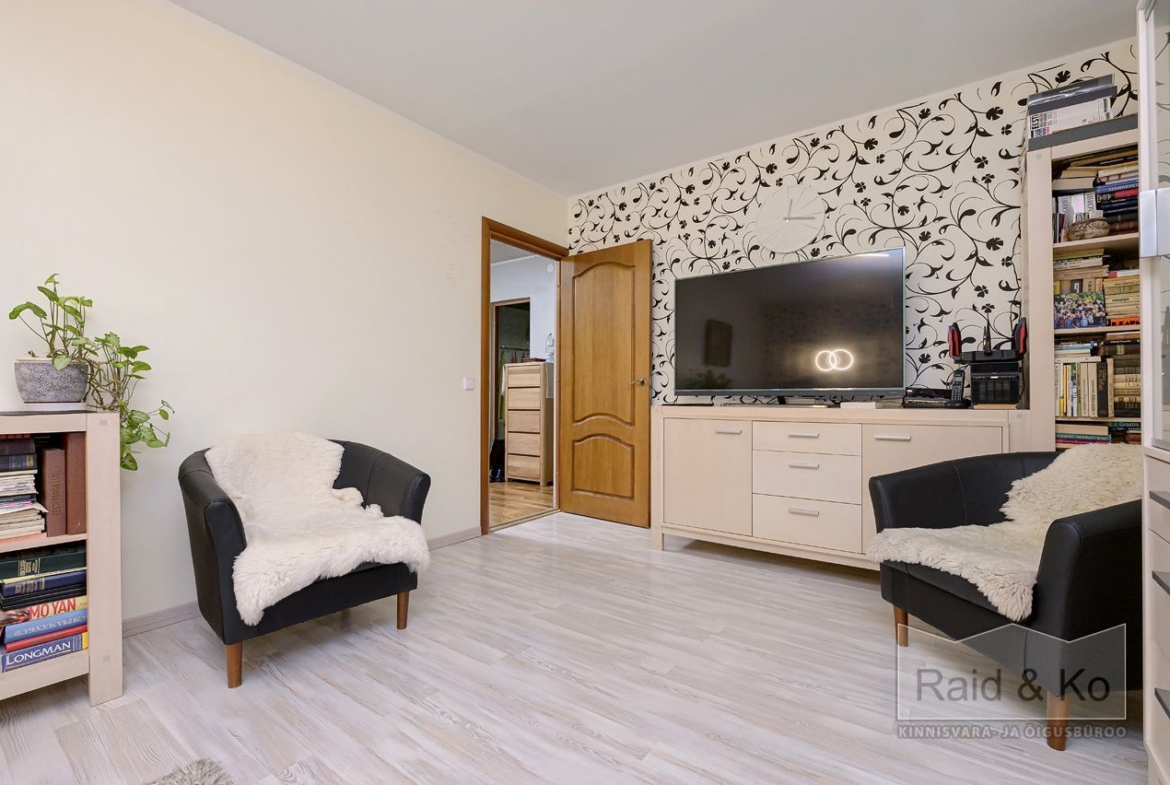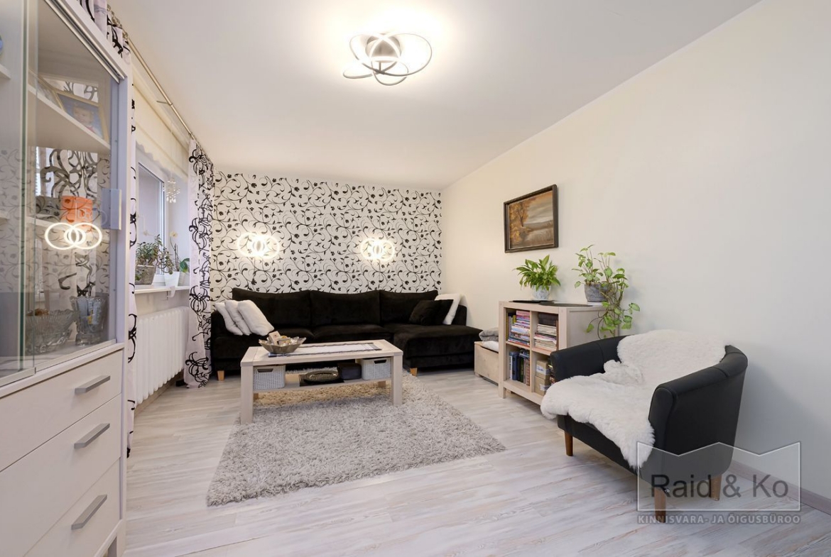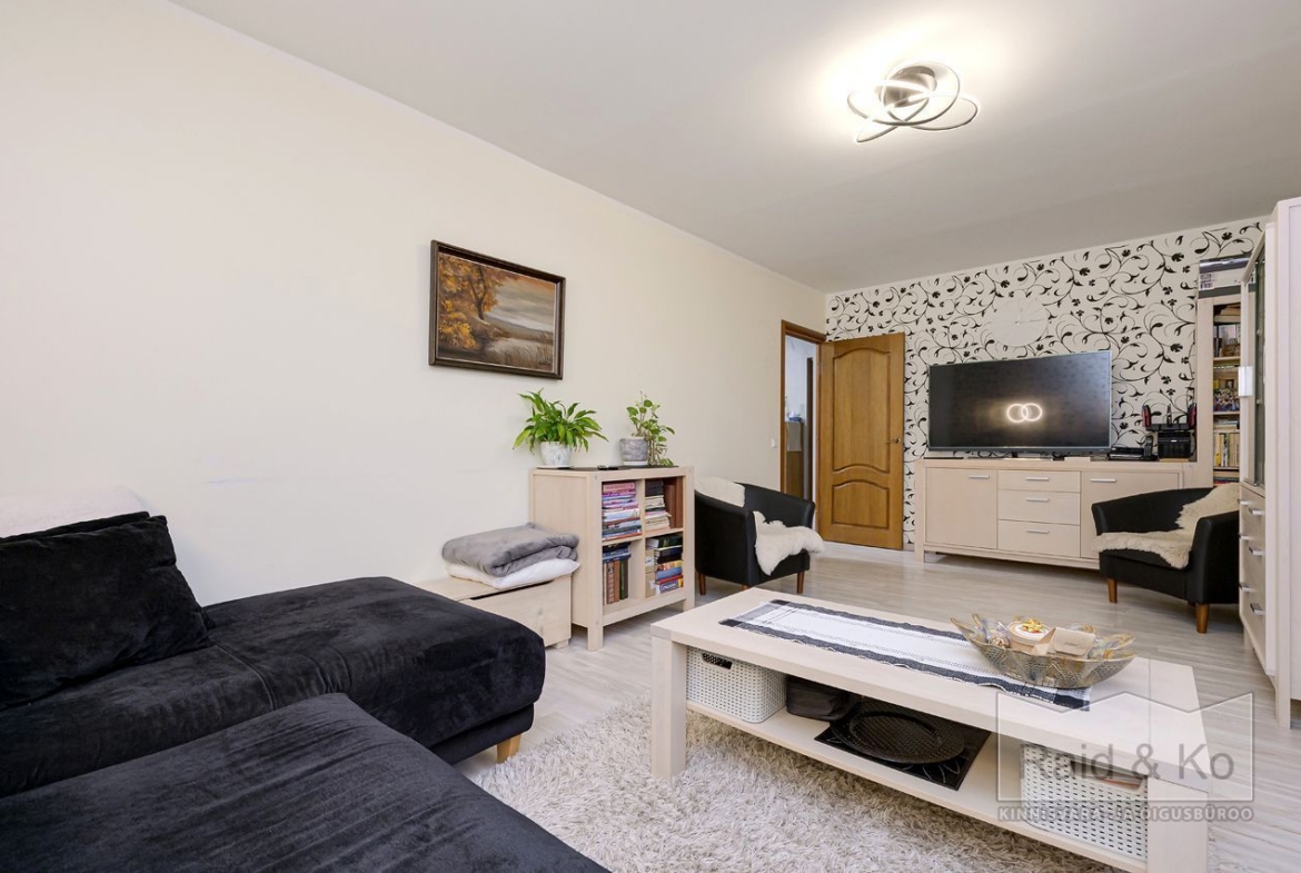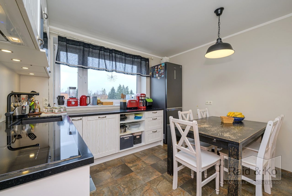 Korteris on suur esik ja köök. Köögimööbel koos sisseehitatud tehnikaga jääb sisse. Köögi tasapinnaks on graniit. Samuti jääb sisse esiku kapp ja suure magamistoa kogu tume puitmööbel.