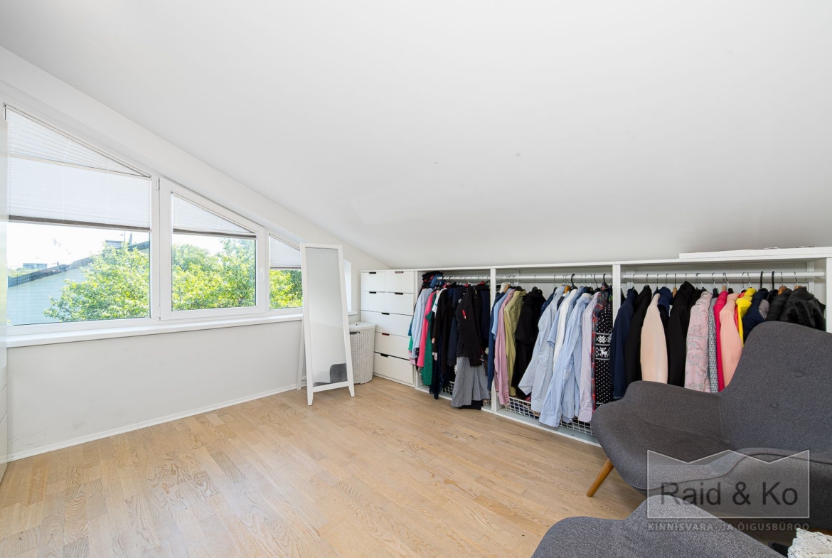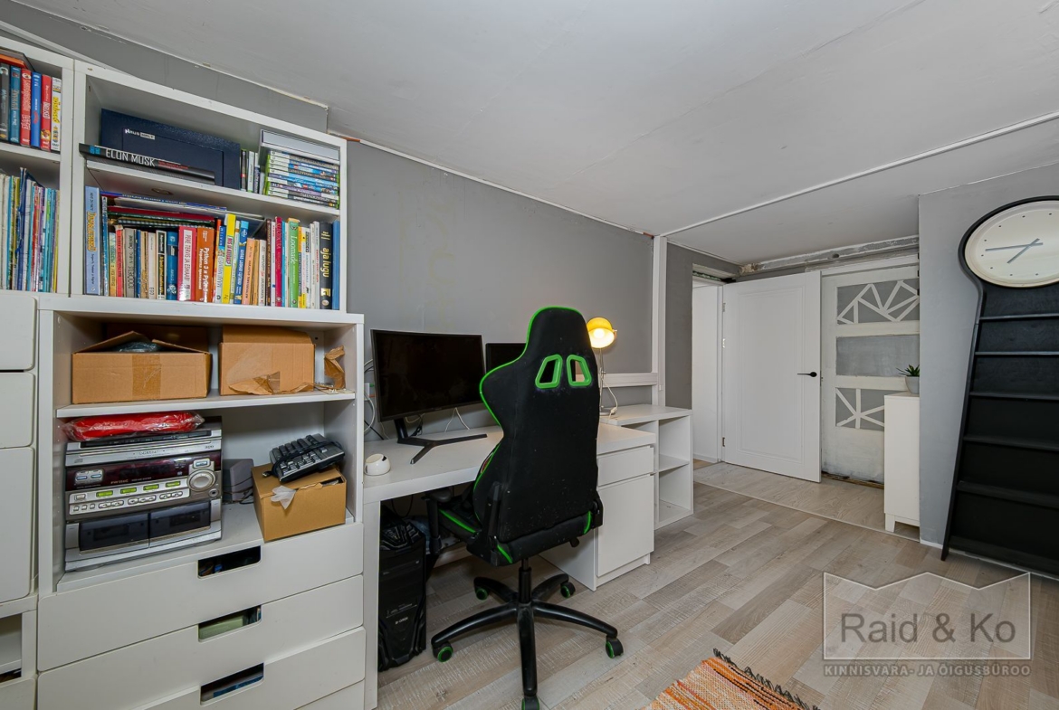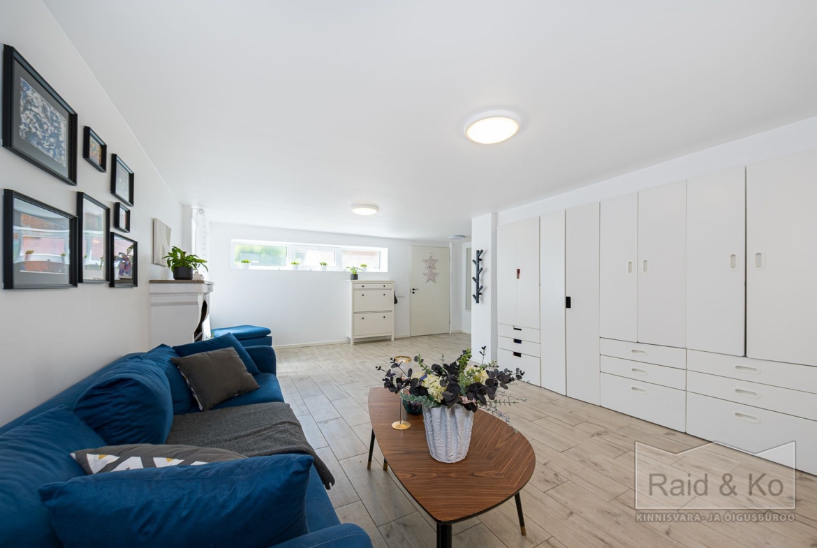 Esimesel korrusel paiknevad kaks avarat tuba ja suur kanaliga garaaž, mida seni on kasutatud panipaikade ja hoiuruumidena. Ruumide planeering ja ligipääs võimaldavad välja ehitada täiesti eraldi sissepääsuga neljatoalise elupinna – lisaks juba olemasolevatele kuuele toale teisel ja kolmandal korrusel. See võib olla iseseisev kodu pereliikmele, üürikorter või eraldatud kodukontor. Haruldane paindlikkus Tallinna linnamaja puhul – väärtus, mis töötab nii täna kui ka homme.