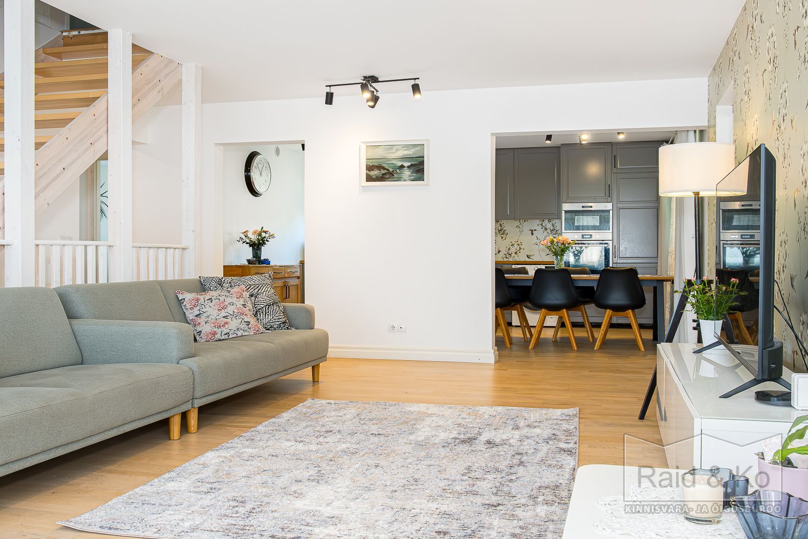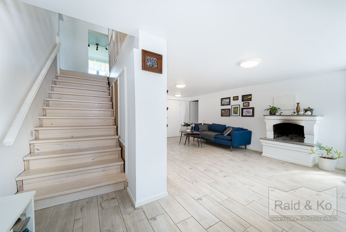 Maja siseviimistlus mõjub rahulikult ja ajatu kvaliteediga. Naturaalne puit, neutraalne värvipalett ja omavahel kokkusobivad detailid loovad ruumi, kuhu uus omanik saab lisada vaid oma iseloomu. Elutuba ja avatud köök saavad päevavalgust läbi suure aknapinna, õhtul lisab sügavust esimese korruse kamina kuma. Kõrgemad laed annavad avarust kogu teisel korrusel, samas kui magamistoad kolmandal korrusel pakuvad märksa privaatsemat äraolemist.