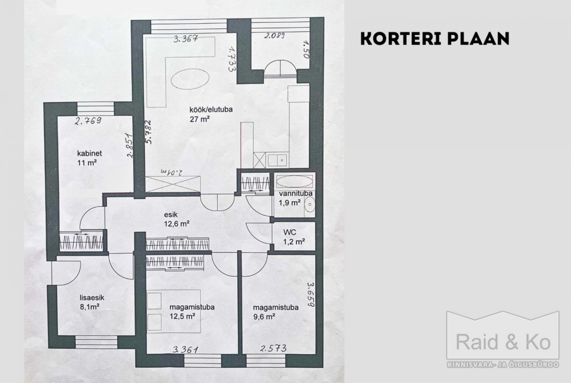 Magamistoas, kabinetis ja esikus on mahukad liugustega kapid. Vannituba ja WC on viimistletud keraamiliste plaatidega ja varustatud kaasaegse sanitaartehnikaga.