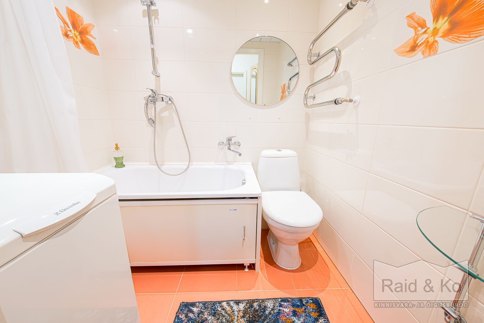 Vannitoas on põrand ja seinad plaaditud. Pesumasin.