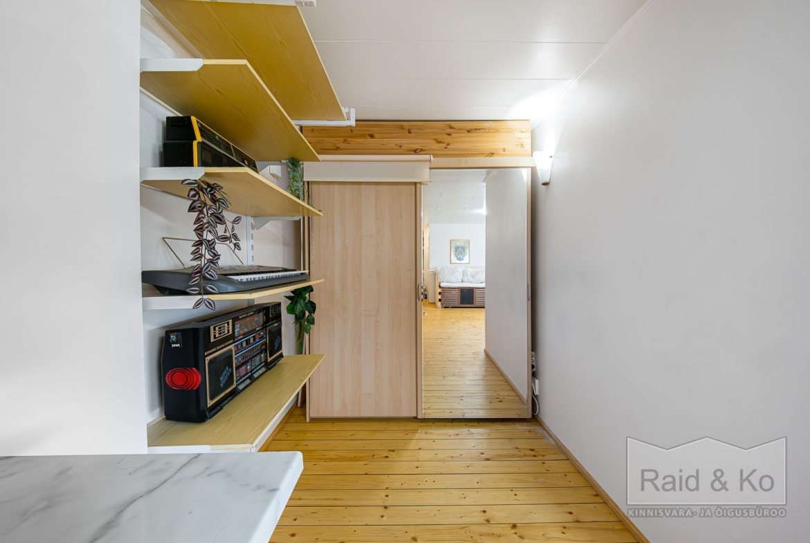 See kahetoaline kodu on valgusküllane, soe ja kohe elamiseks valmis. Teisel korrusel paiknev, hoovipoolsete akendega korter üllatab oma avara muljega. Köök on avatud elutuppa ning magamistoa laiuse arvelt on loodud juurde hästi paigutatud garderoobiala.
