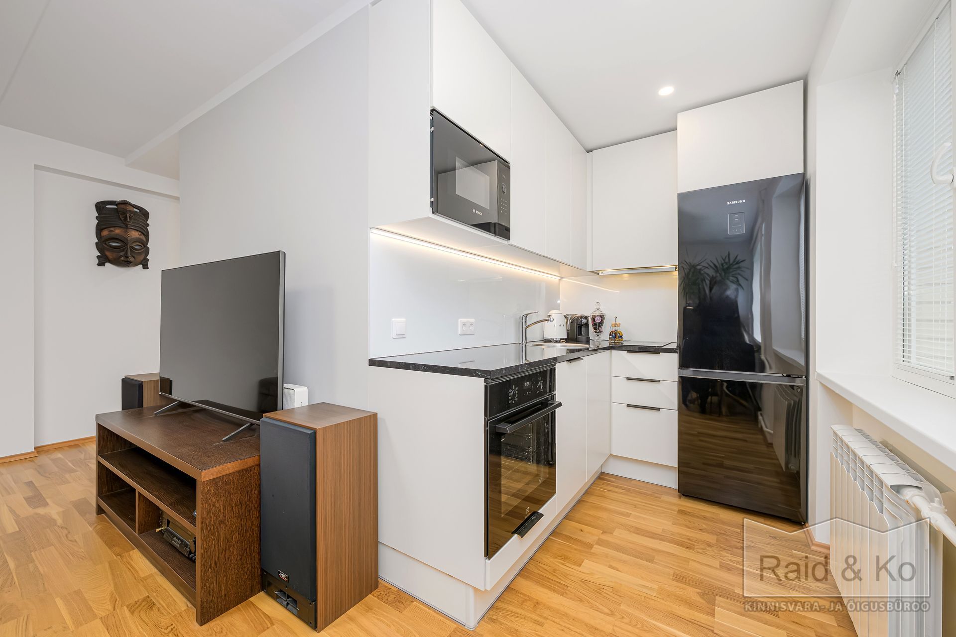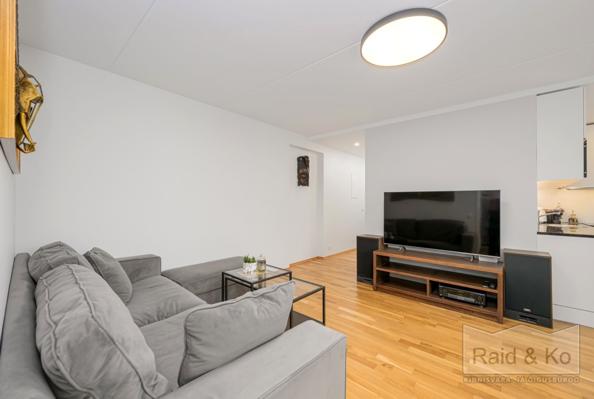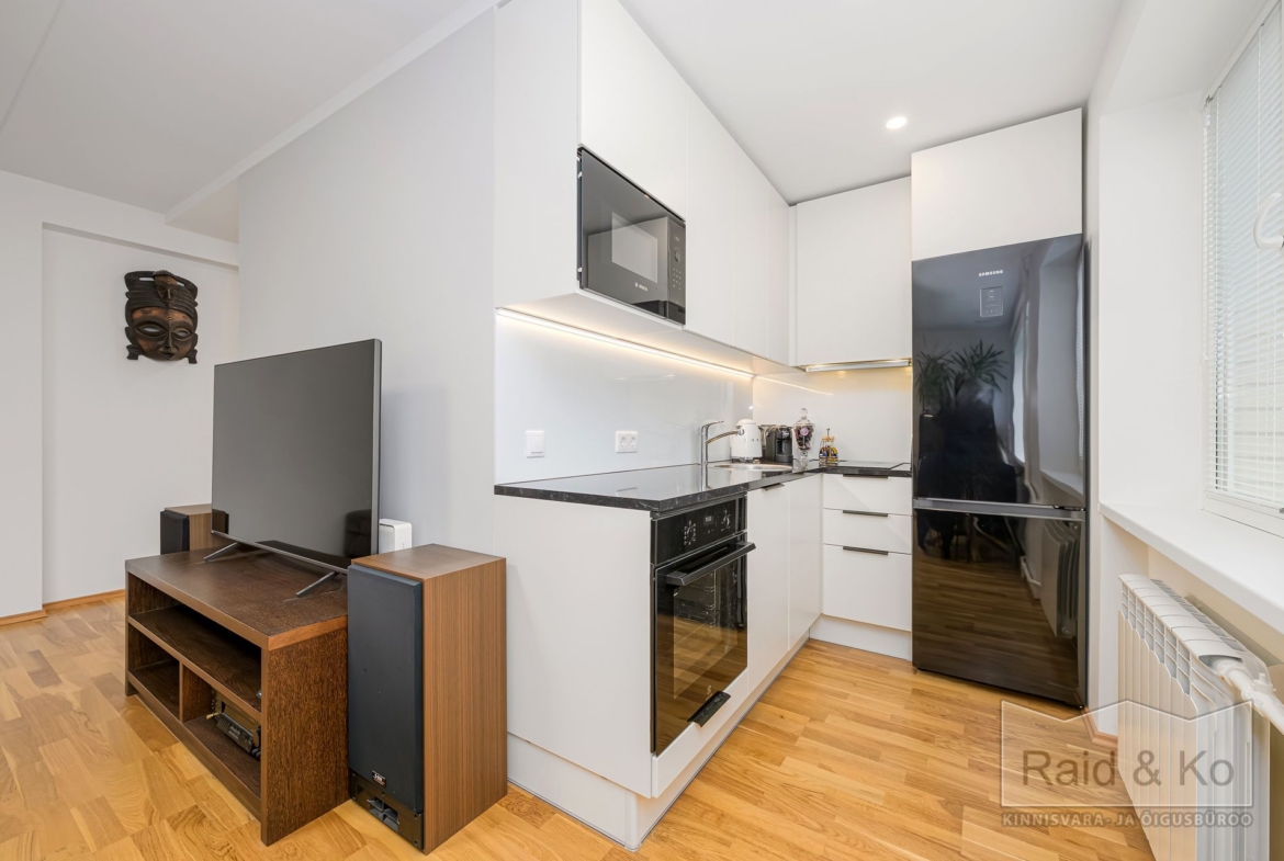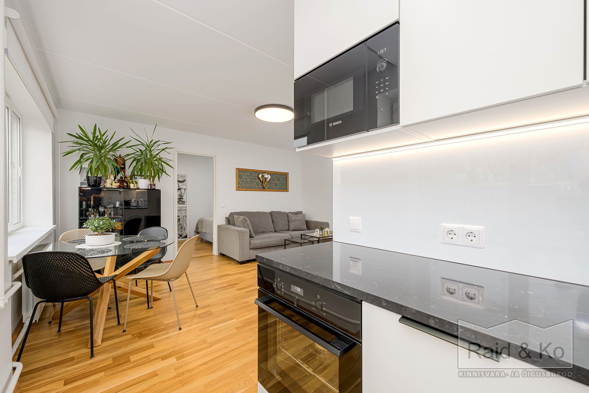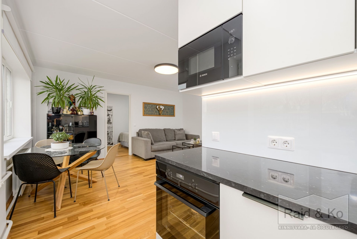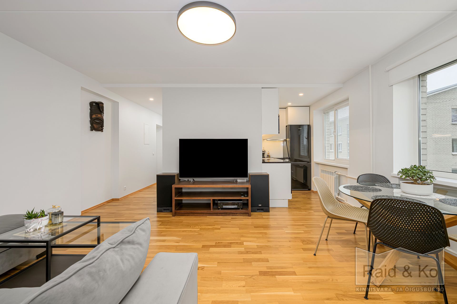 Põrandatel naturaalne puitparkett. Köögimööbel tehnikaga k.a. nõudepesumasin. Vannitoas on elektripõrandaküte. Korterisse ei jää kõlarid ja seinakaunistused.