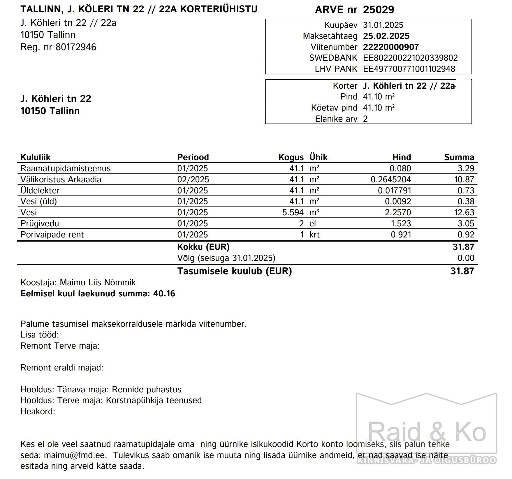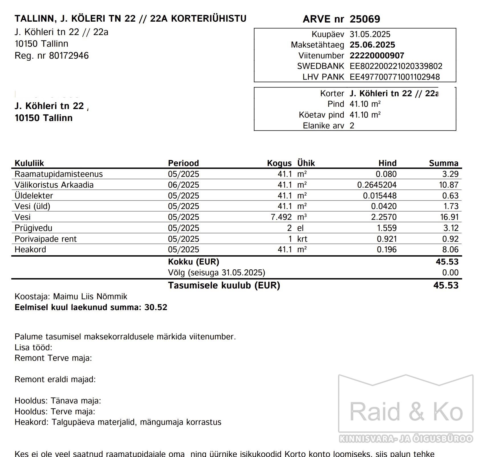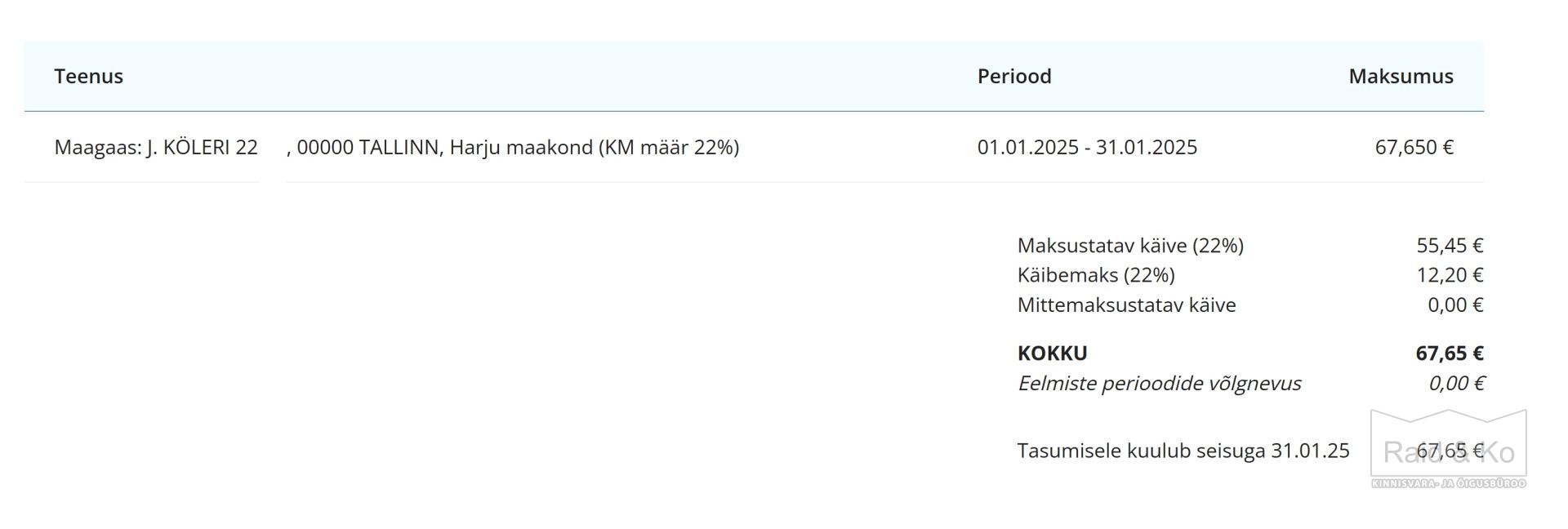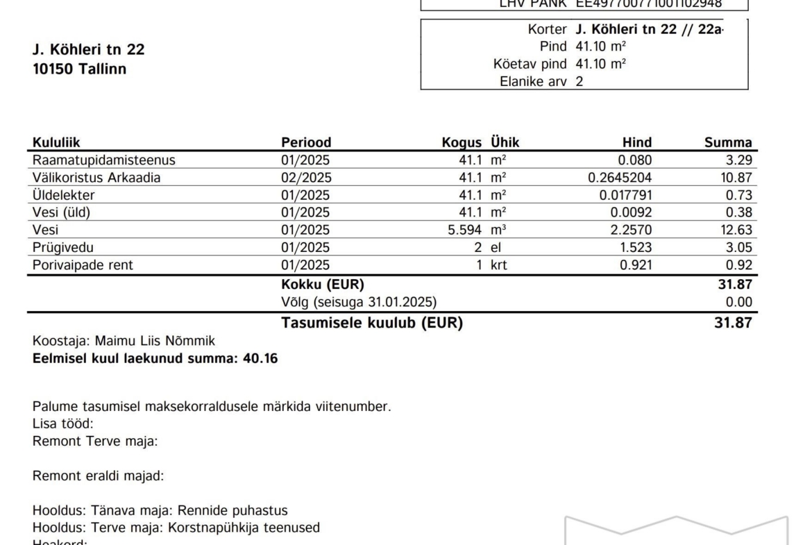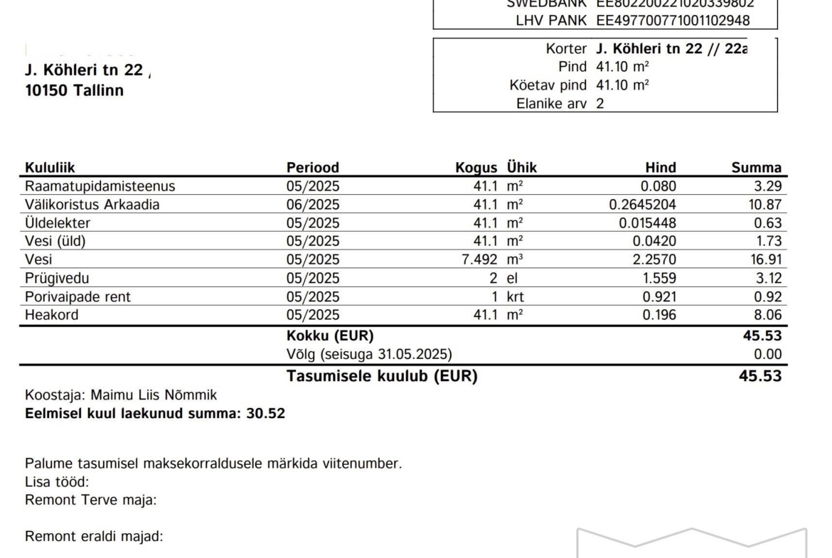 Kommunaalkulud on madalad. Aastaringi on kommunaalkulu mida tasutakse korteriühistule jäänud vahemikku ca 30-45 eurot. Gaasi arve jaanuari eest oli 68 eurot, juuni eest vaid 6 eurot. Korteriühistul laenukohustusi ei ole. Ühist remondifondi ei koguta. Majja on toodud interneti valguskaabel.