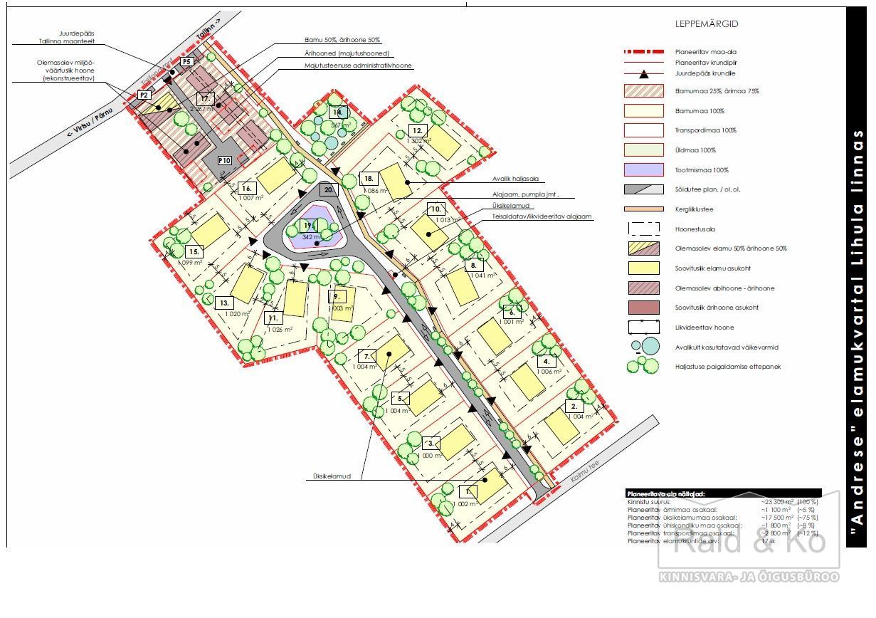 Kinnistu sihtotstarve 60% elamumaa ja 40% ärimaa. Ligi 3/4 kinnistust on hoonestamata, õuemaa 3162 m², muu maa 20138 m². Tehtud DP eskiisplaan elamukruntideks jagamiseks, detailplaneeringut pole alustatud.