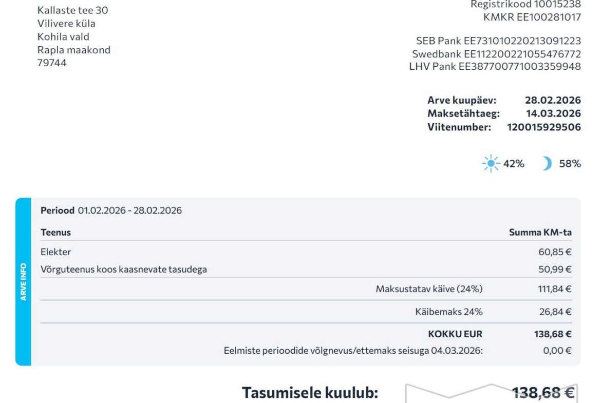 Elektri arved on 2025 a olnud suvel 40 ja talvel kuni 105 eur/kuus.
