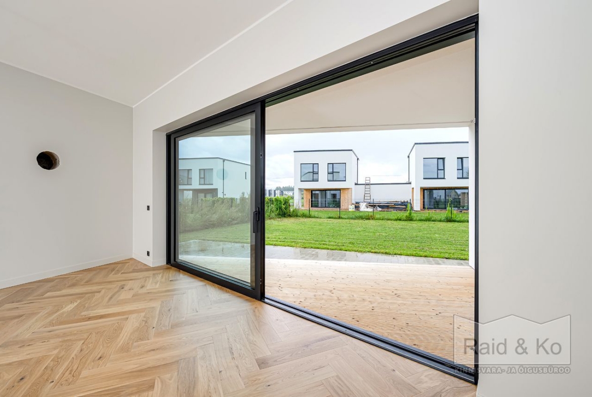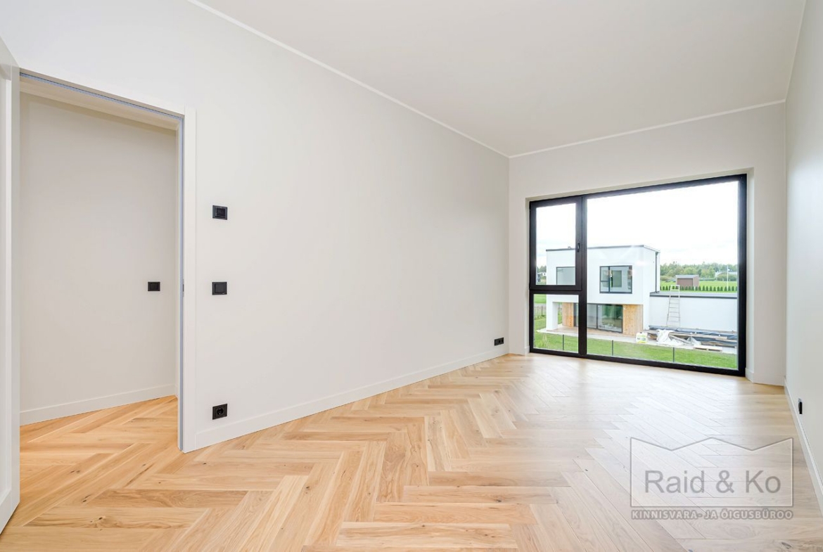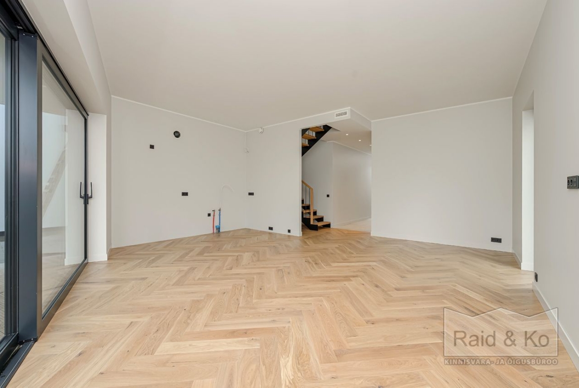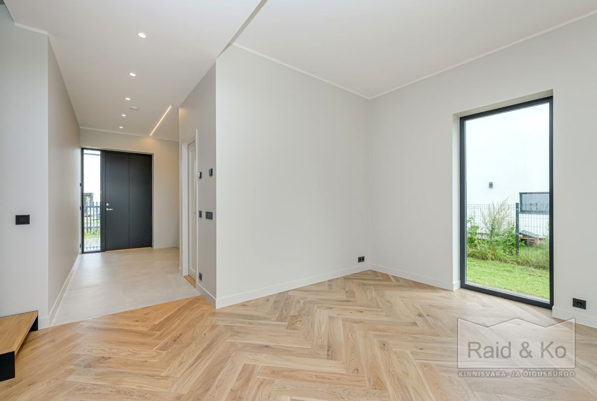 Esimene korrus: avar esik. Köök-elutuba pääsuga terrassile suure liugukse kaudu. Saun ja duširuum, millel samuti pääs õue. Elutoas valmidus kamina paigaldamiseks.