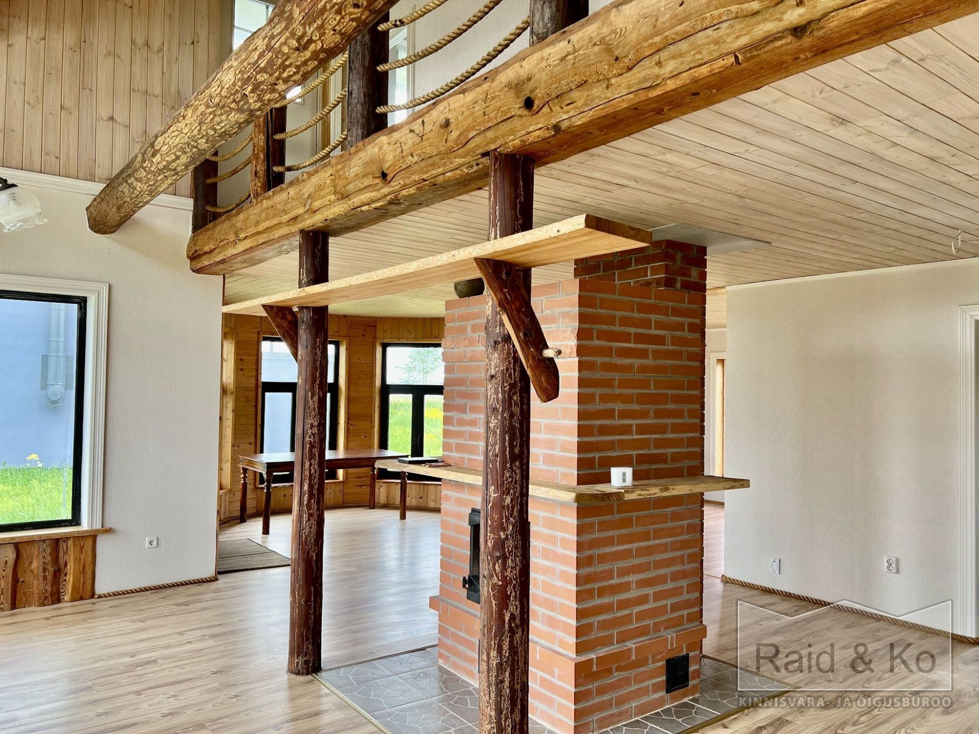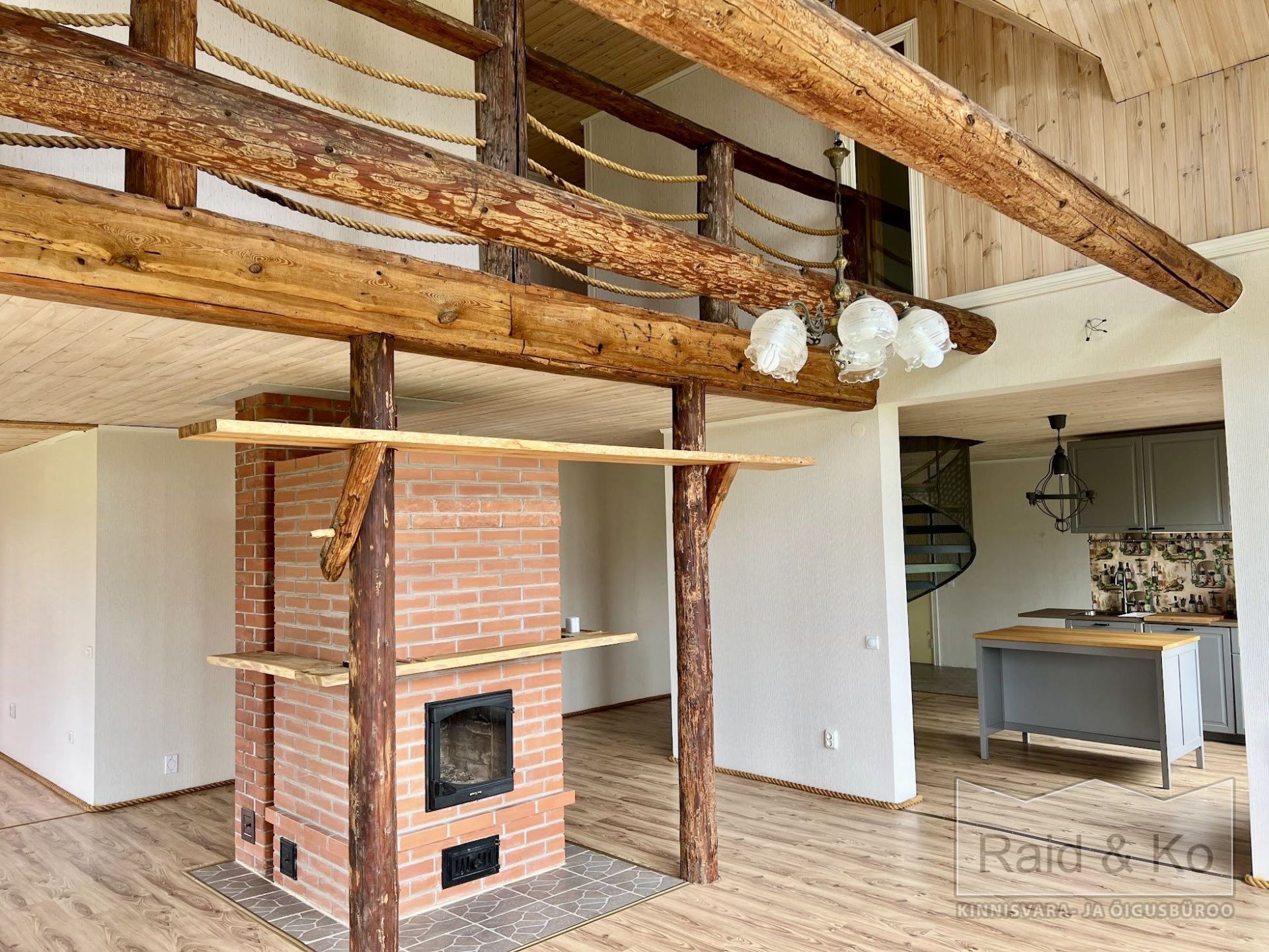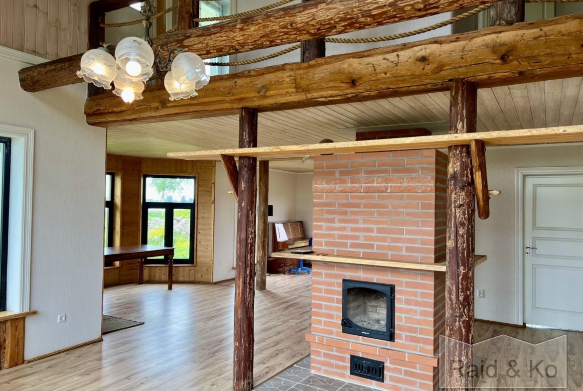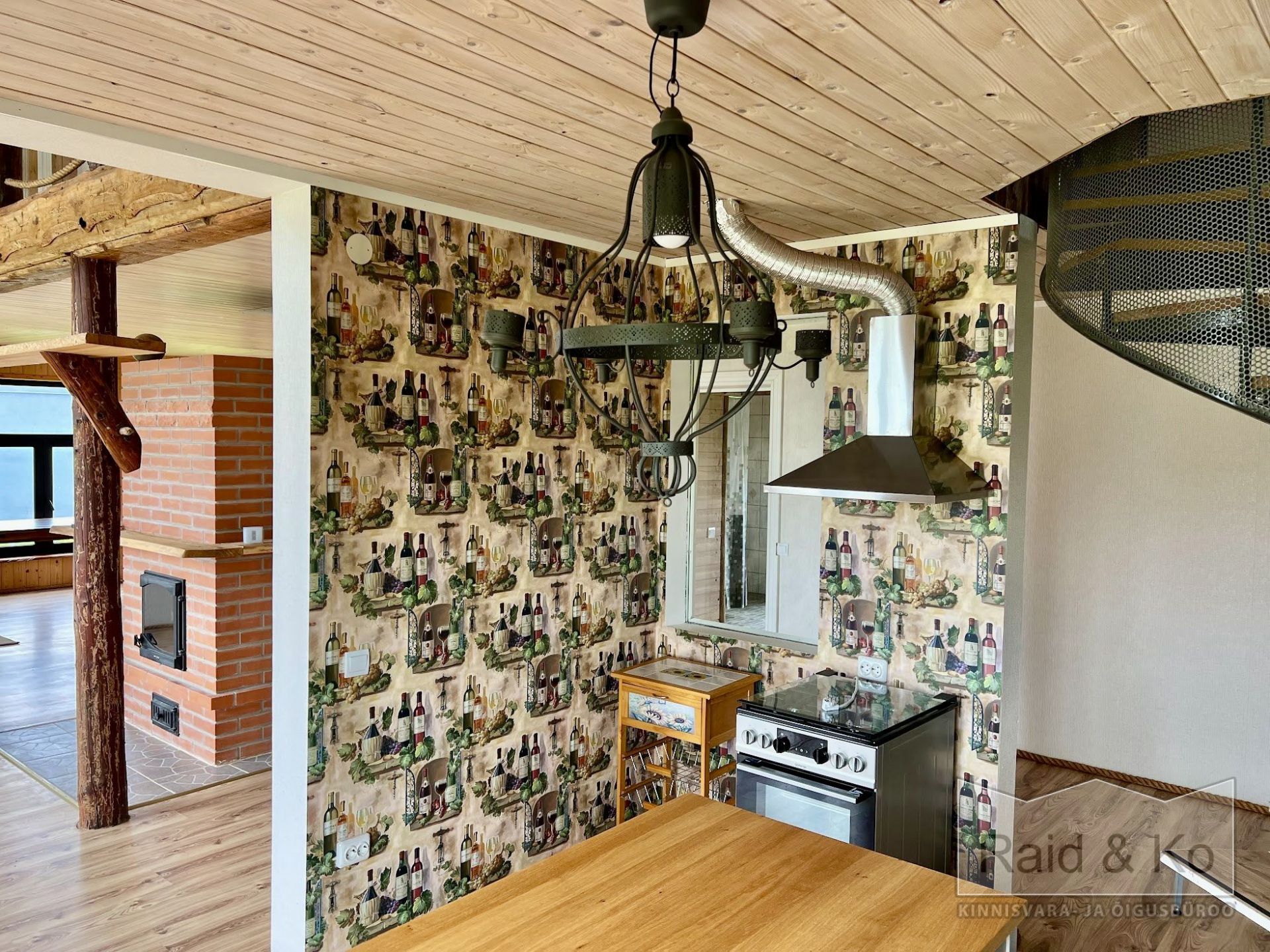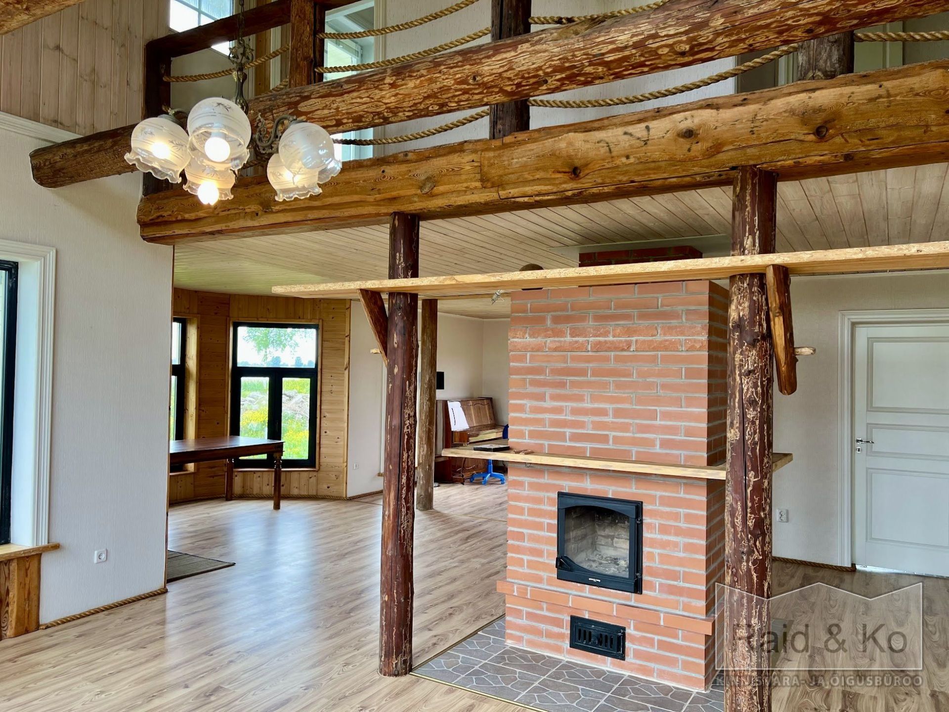 Esimesel korrusel on läbi kahe korruse ulatuv elutuba, köök, puuküttega saun, WC/ vannituba, garaaž, katlaruum ja puukuur. Elutoas on soojustsalvestav kamin-ahi.