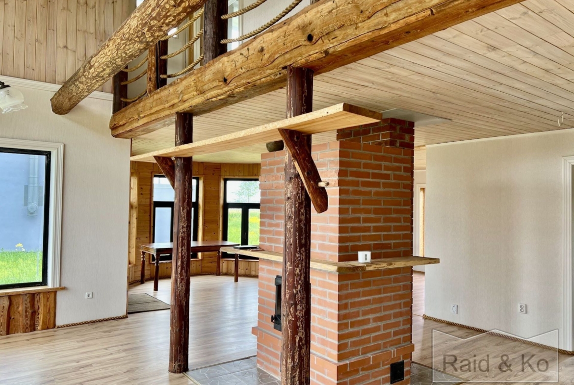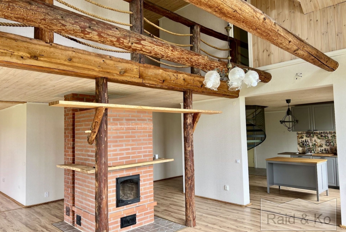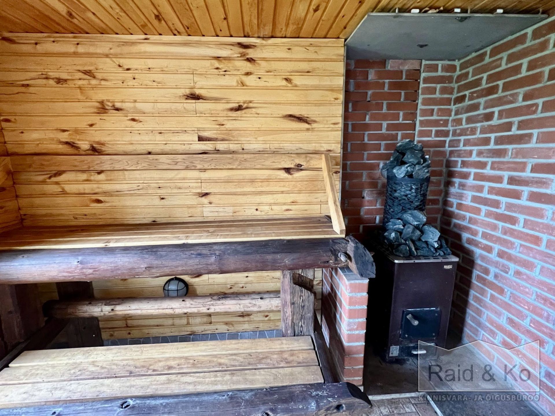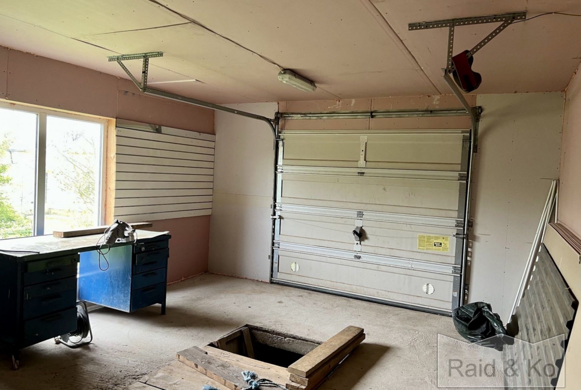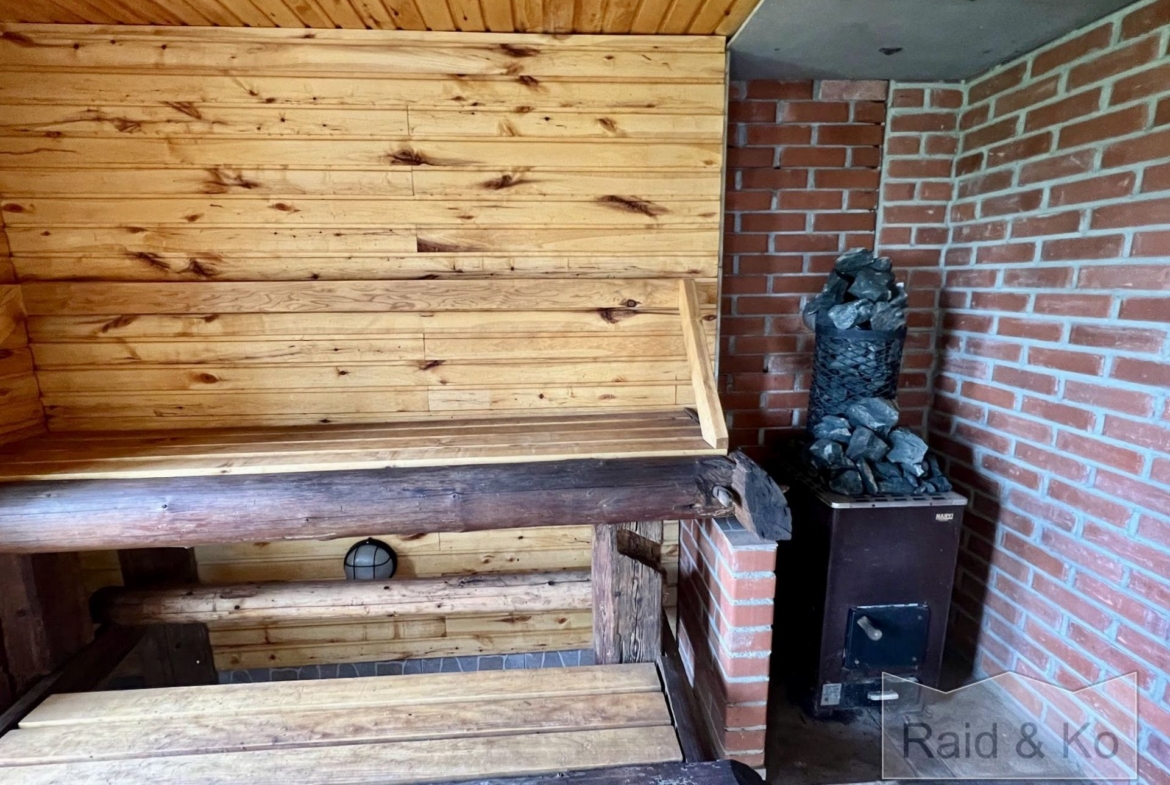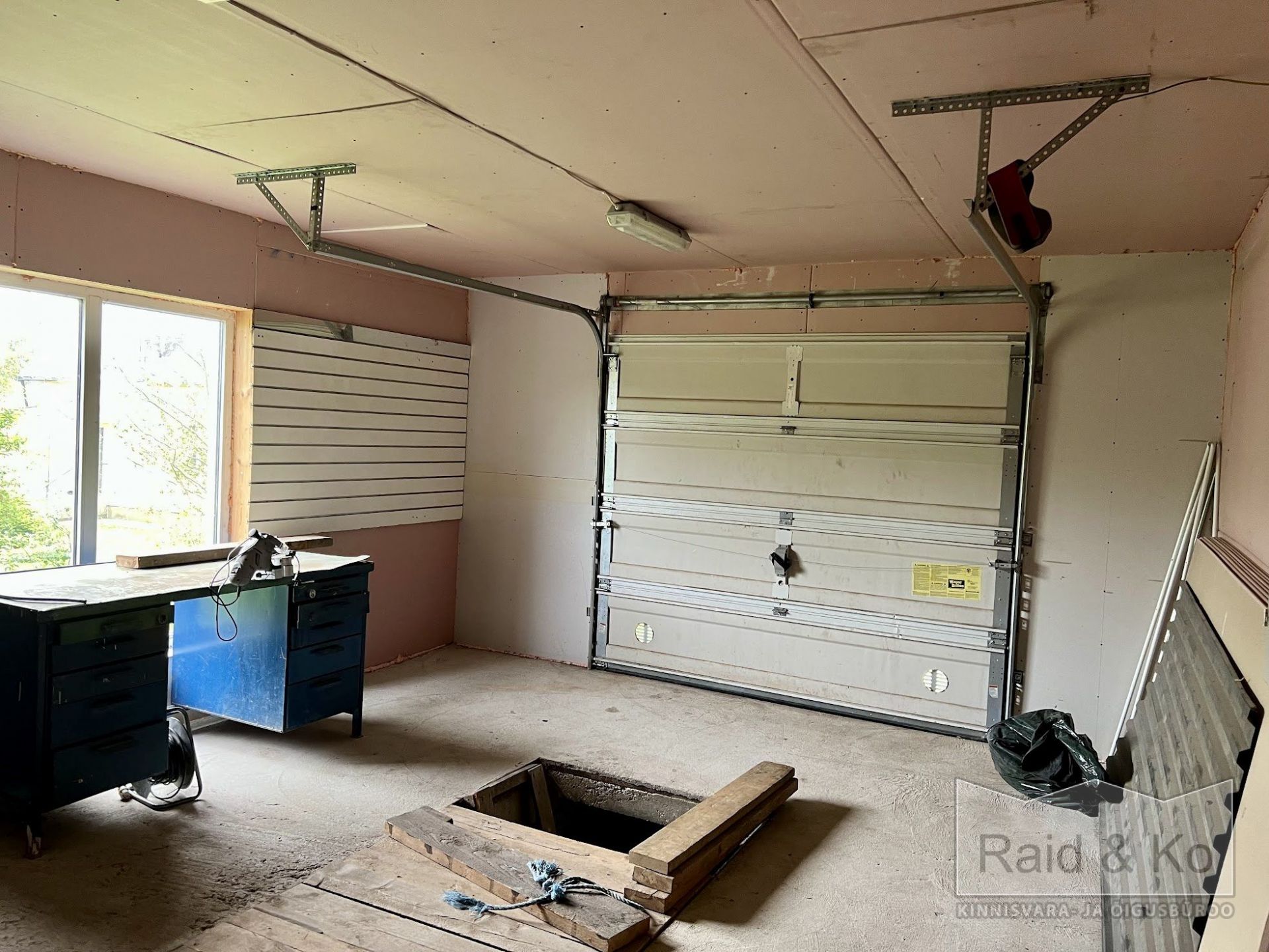 Esimesel korrusel on läbi kahe korruse ulatuv elutuba, köök, puuküttega saun, WC/ vannituba, garaaž, katlaruum ja puukuur. Elutoas on soojustsalvestav kamin-ahi.