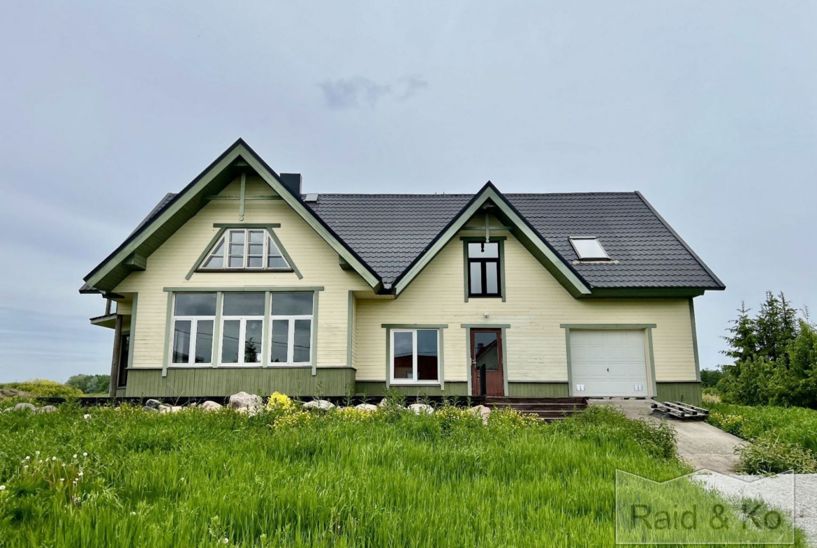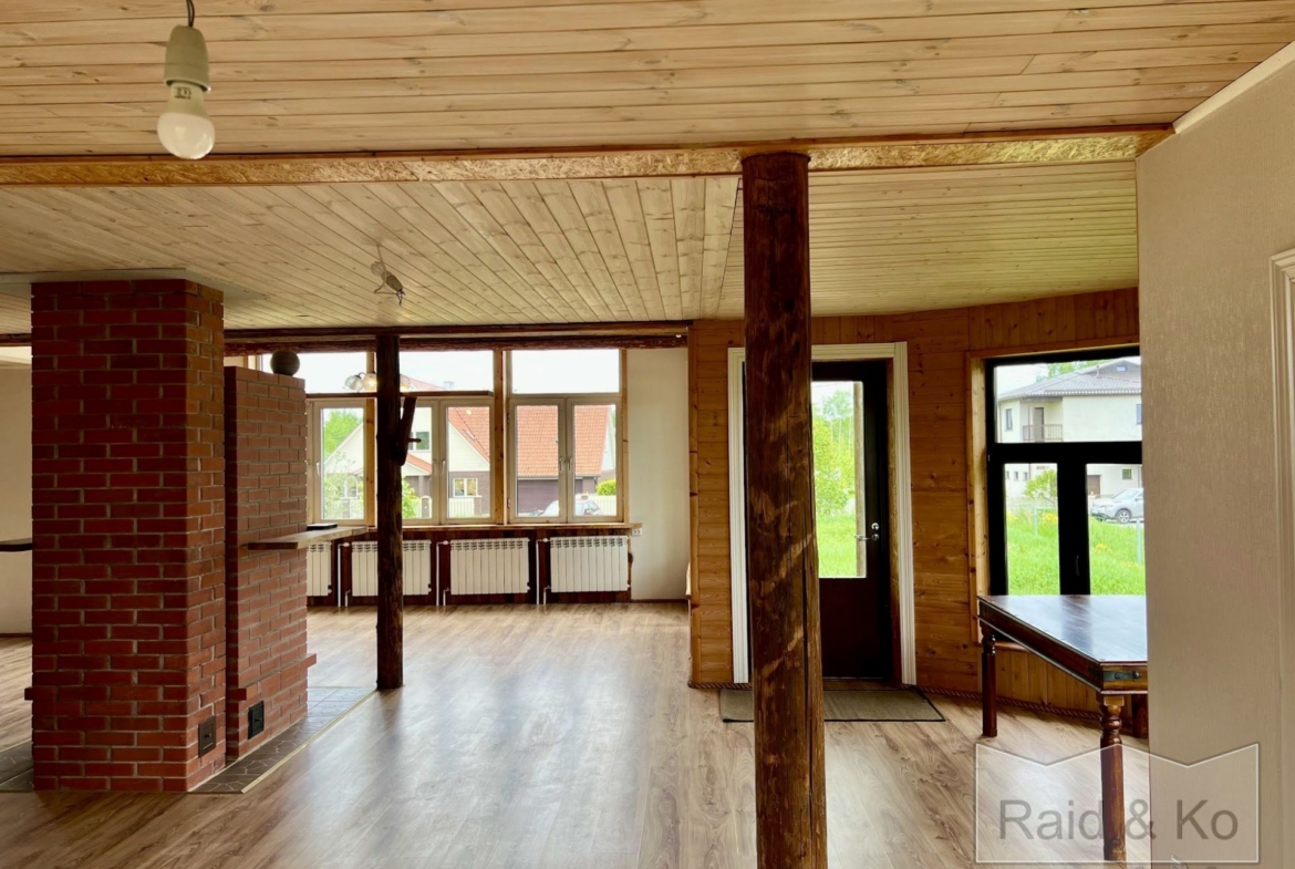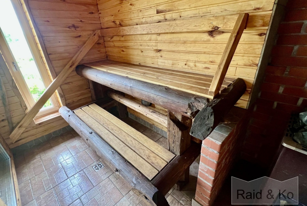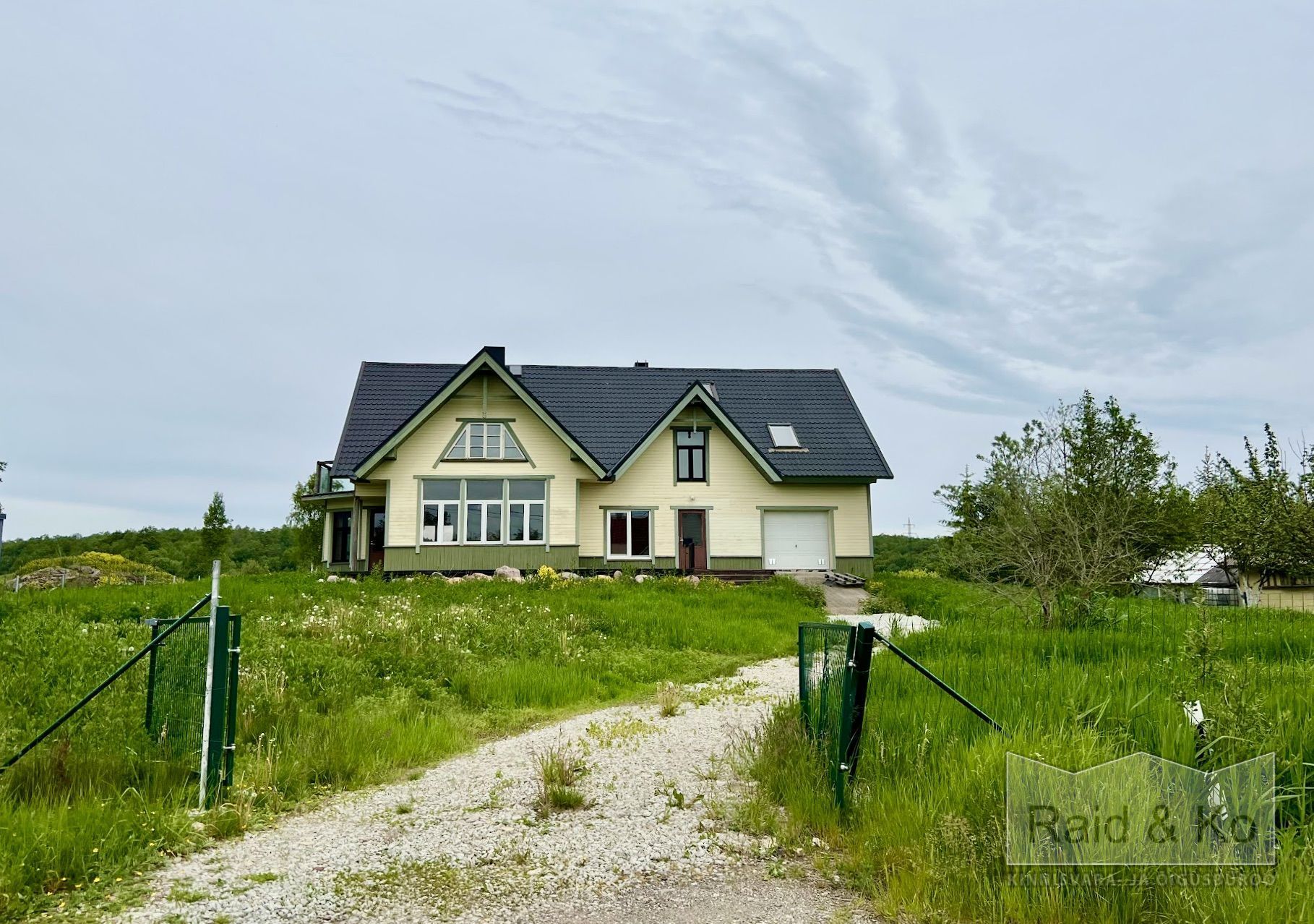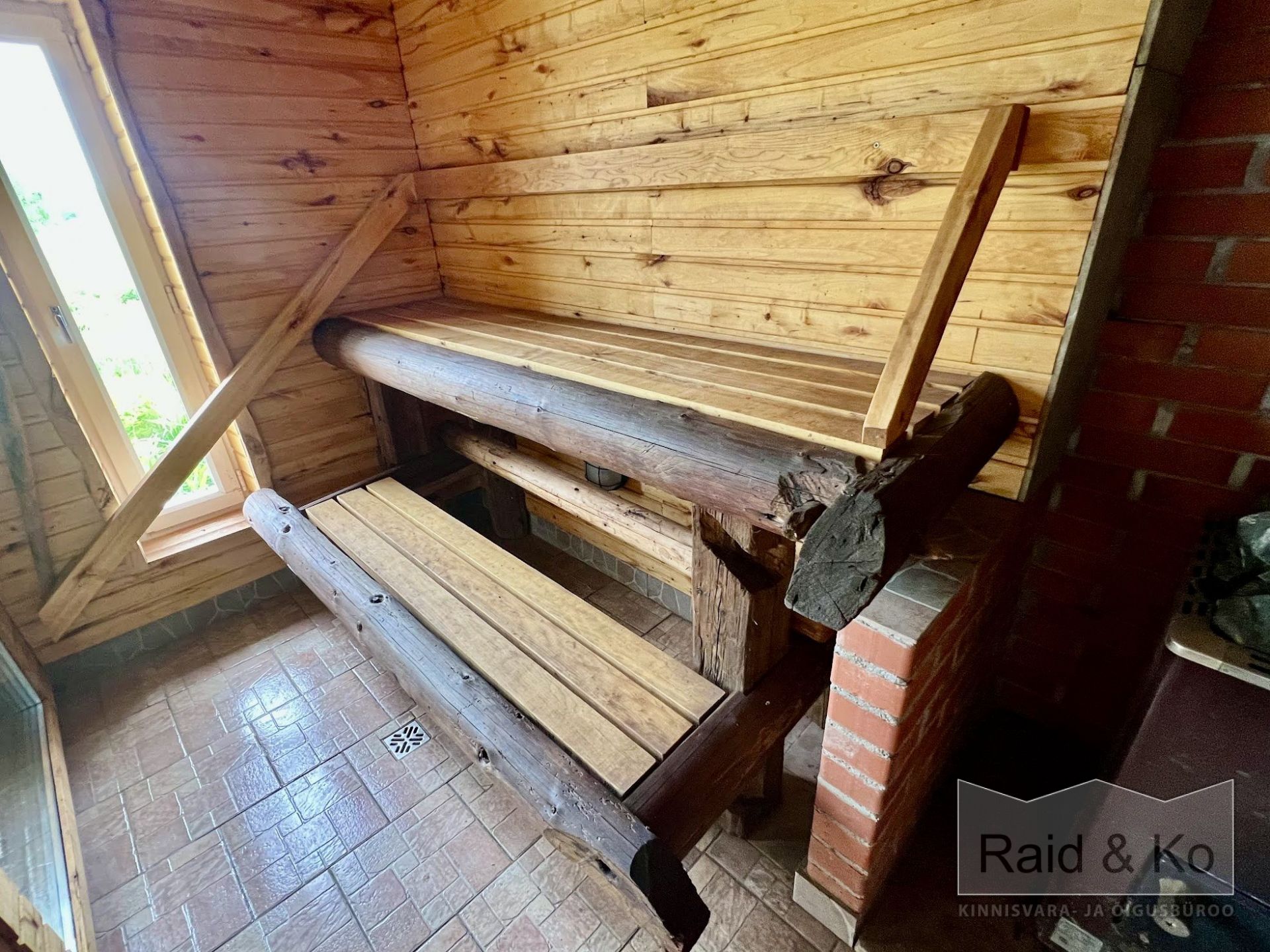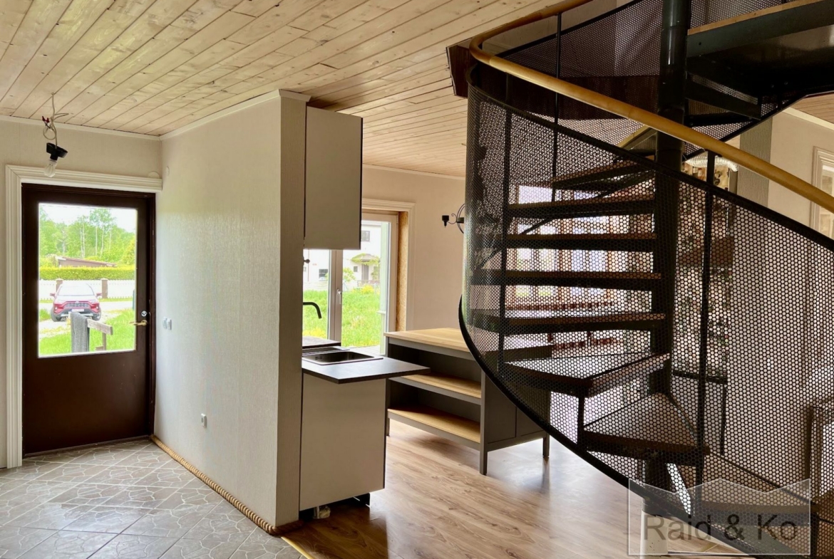 Esimesel korrusel on läbi kahe korruse ulatuv elutuba, köök, puuküttega saun, WC/ vannituba, garaaž, katlaruum ja puukuur. Elutoas on soojustsalvestav kamin-ahi.