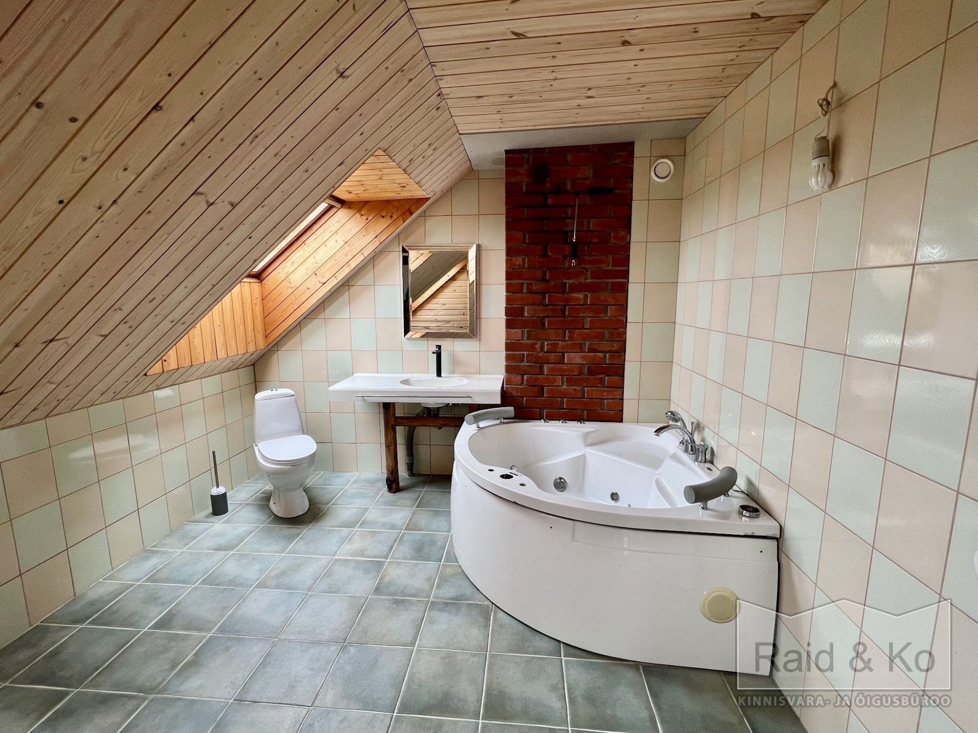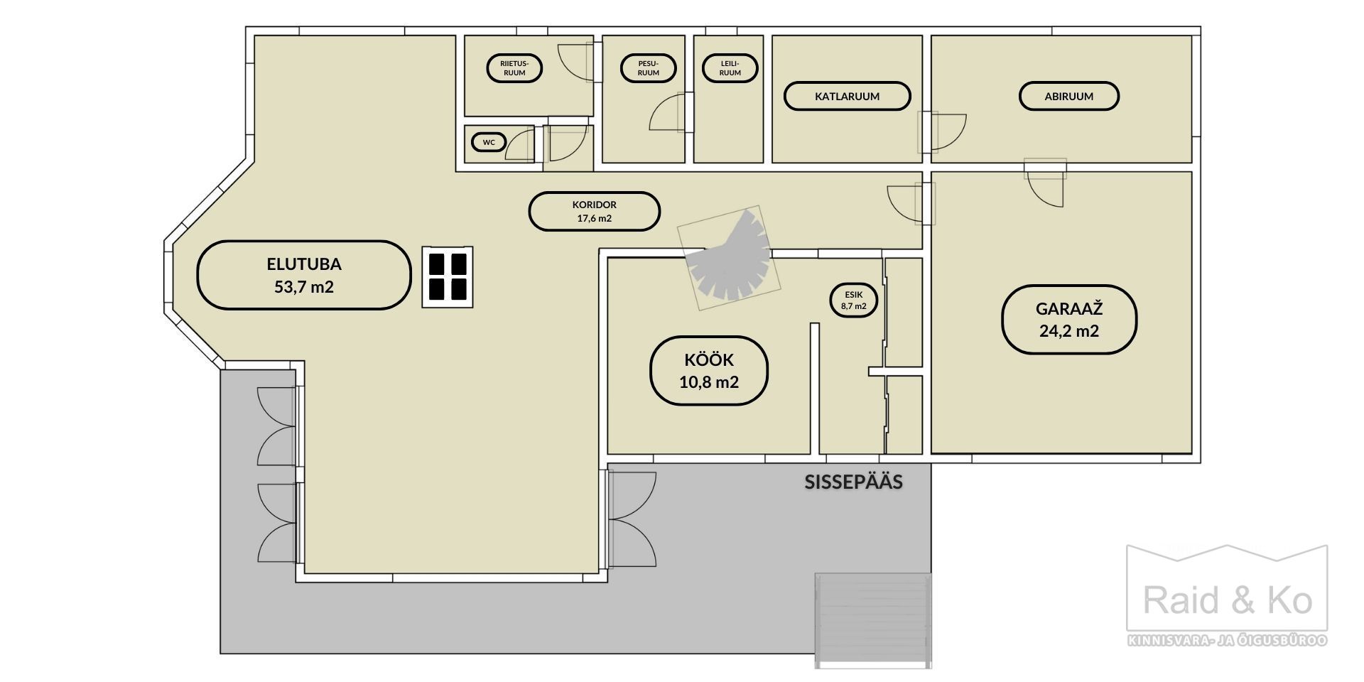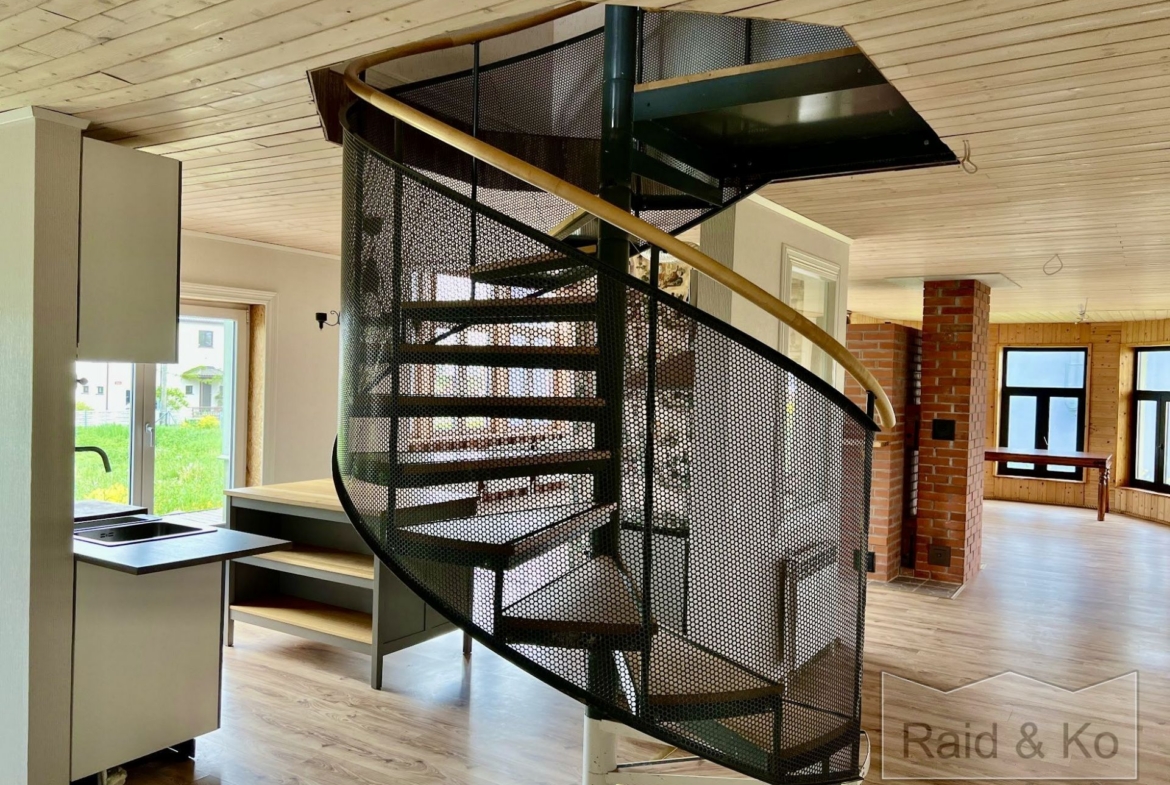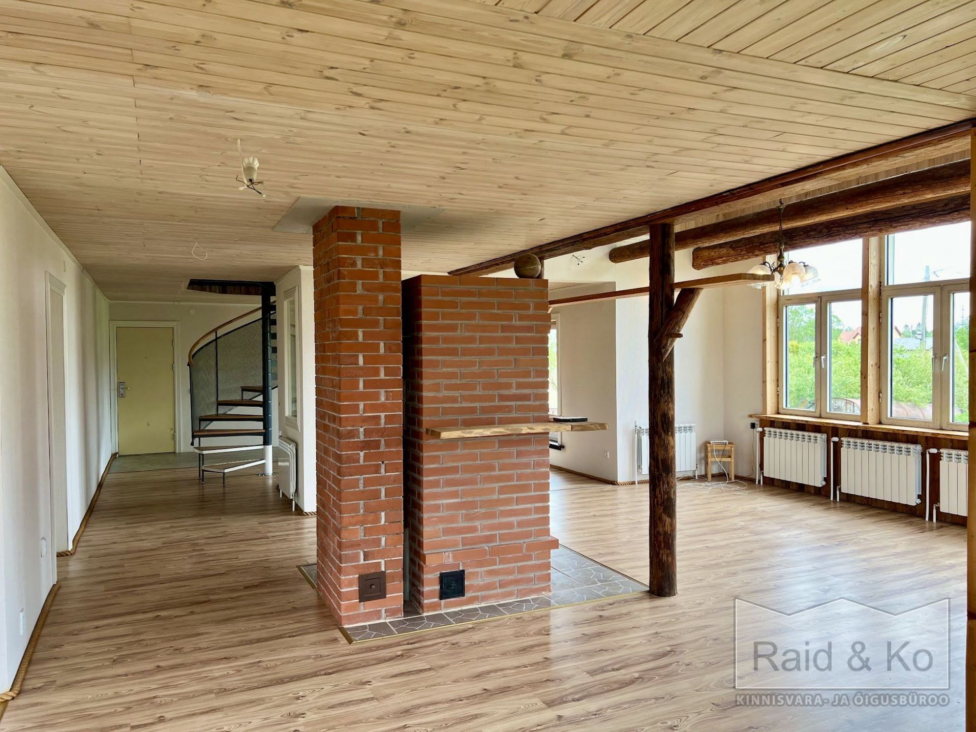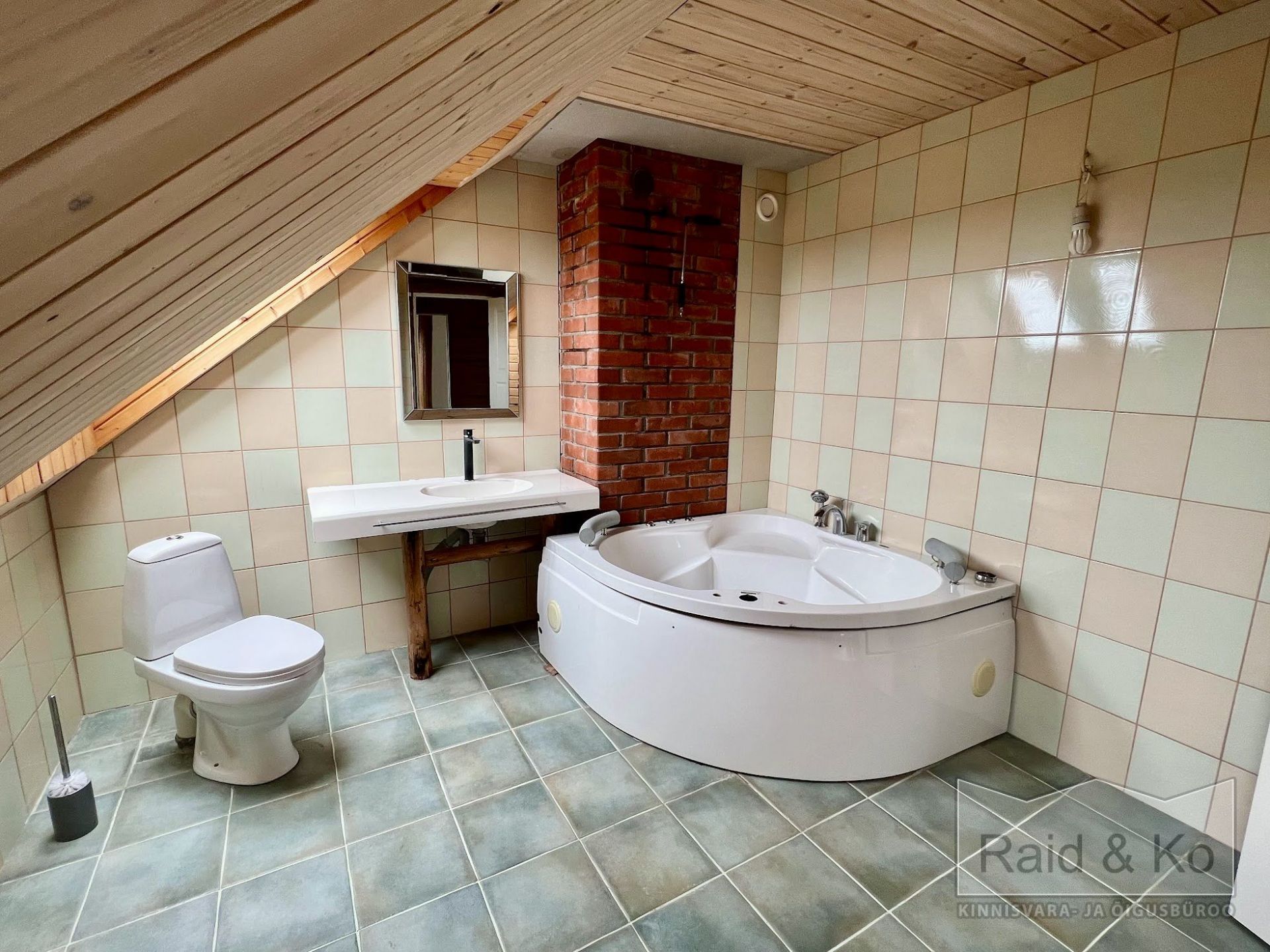 Esimesel korrusel on läbi kahe korruse ulatuv elutuba, köök, puuküttega saun, WC/ vannituba, garaaž, katlaruum ja puukuur. Elutoas on soojustsalvestav kamin-ahi.