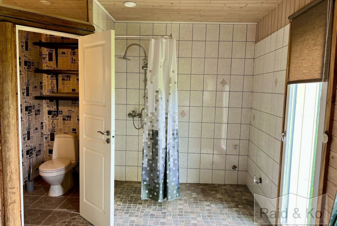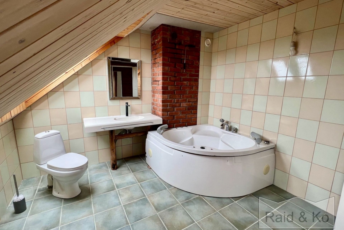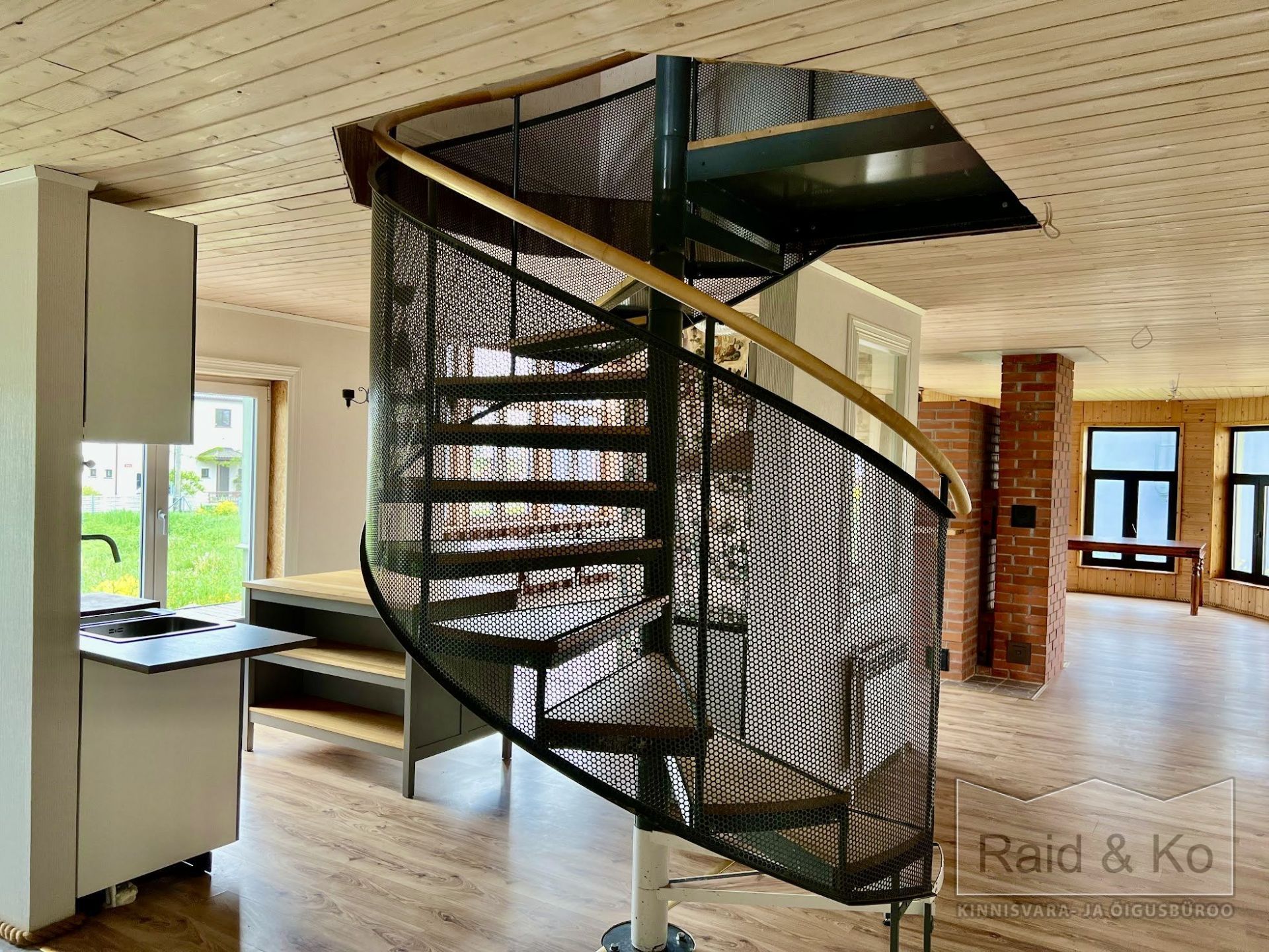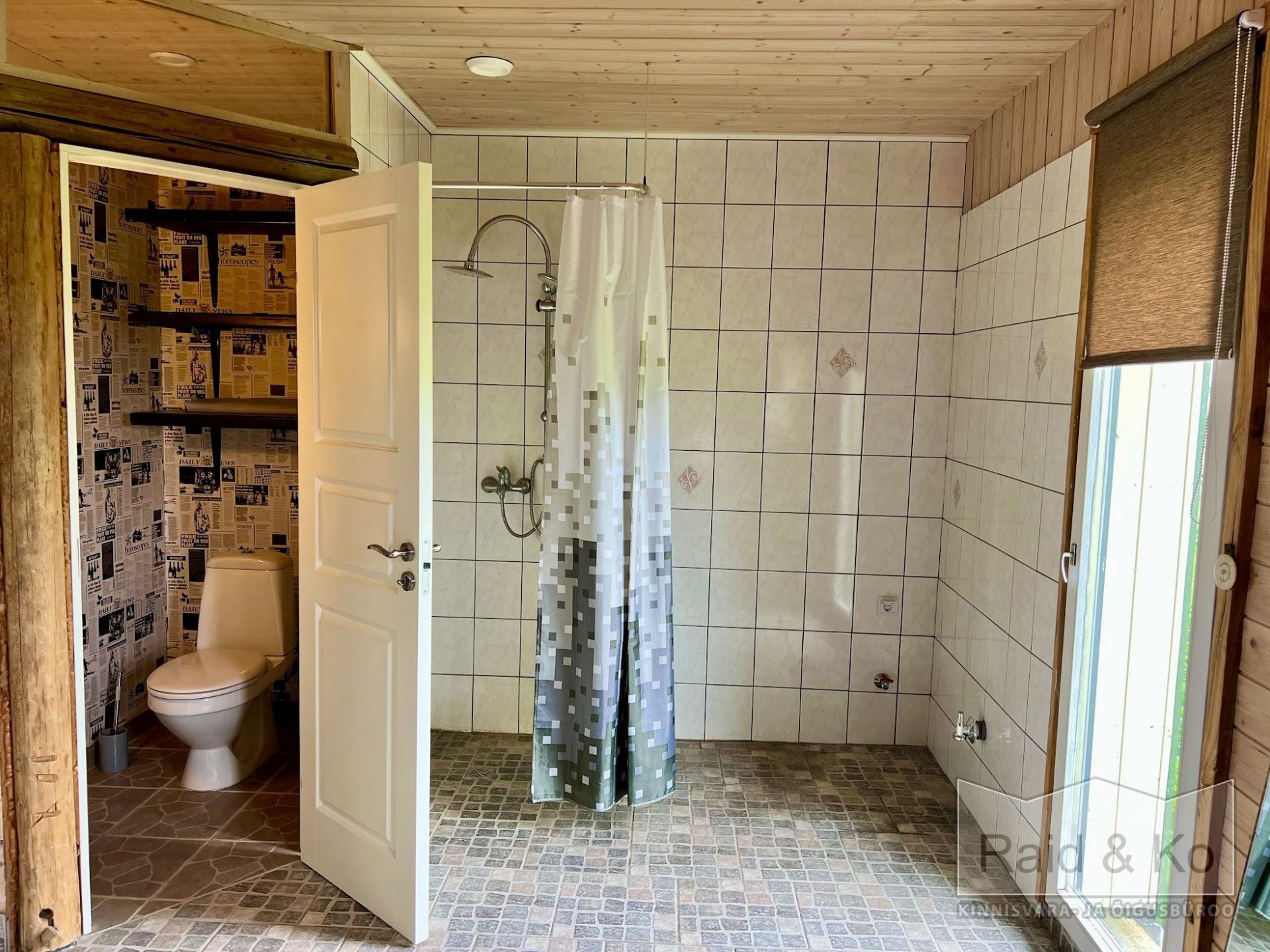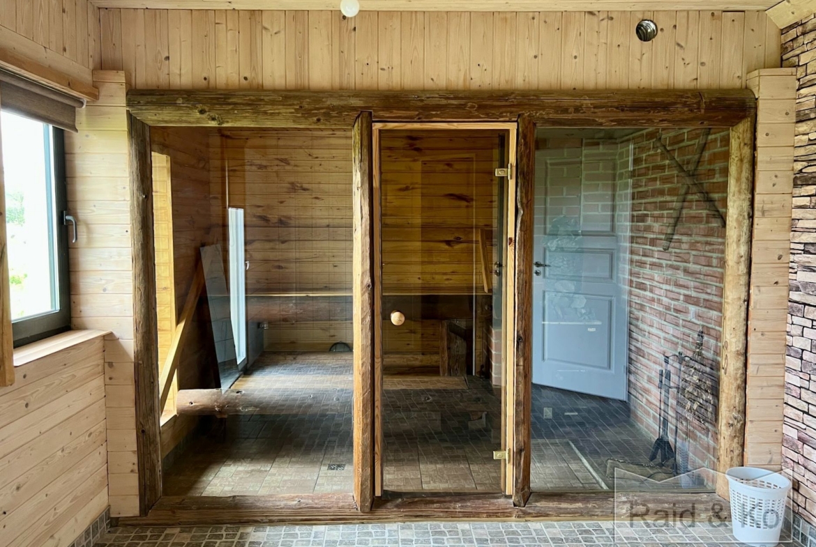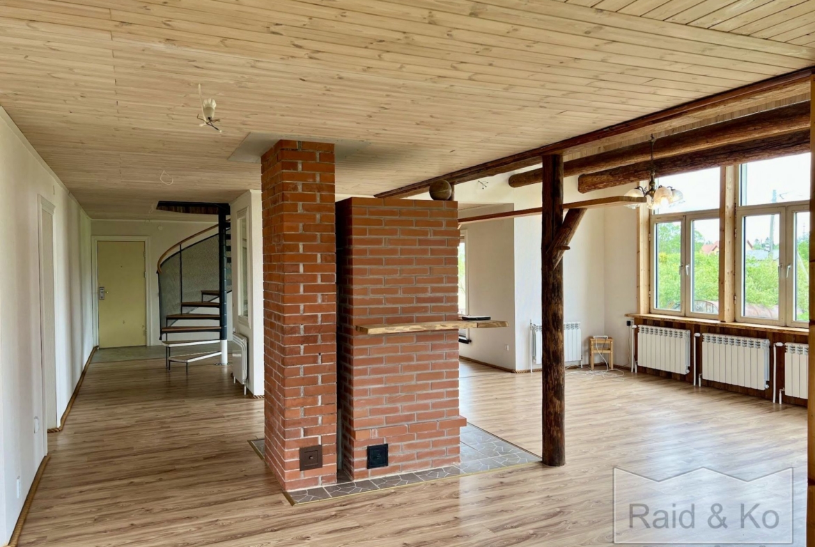 Esimesel korrusel on läbi kahe korruse ulatuv elutuba, köök, puuküttega saun, WC/ vannituba, garaaž, katlaruum ja puukuur. Elutoas on soojustsalvestav kamin-ahi.