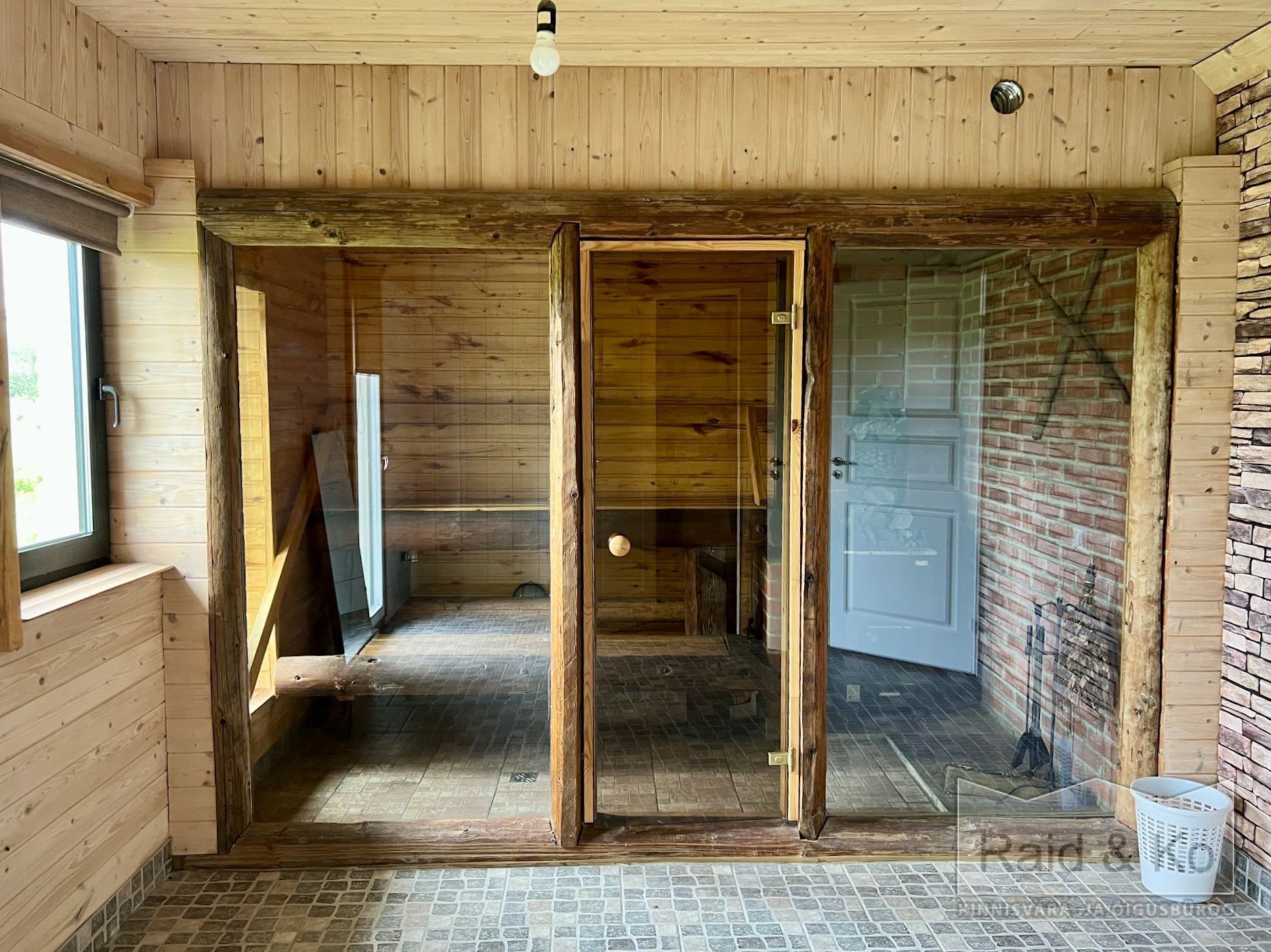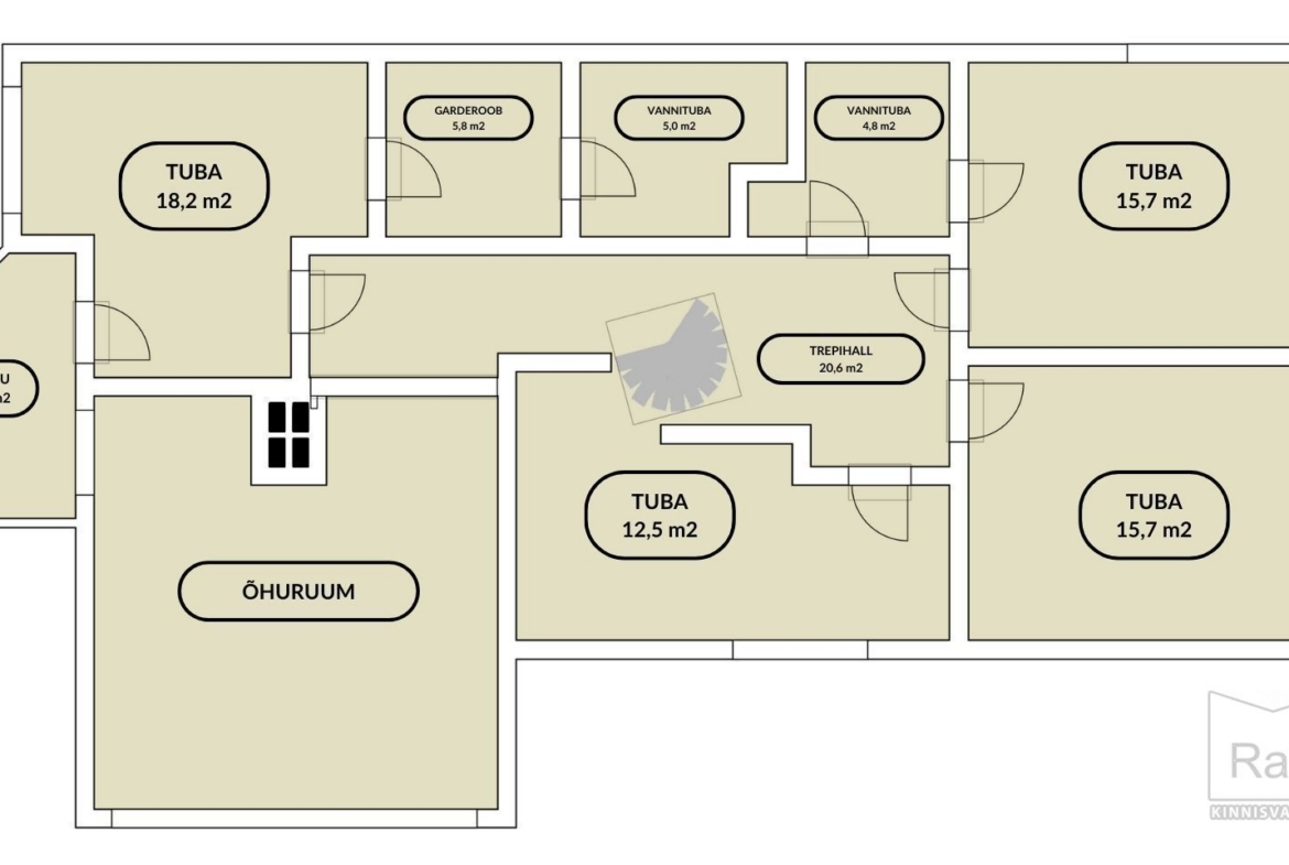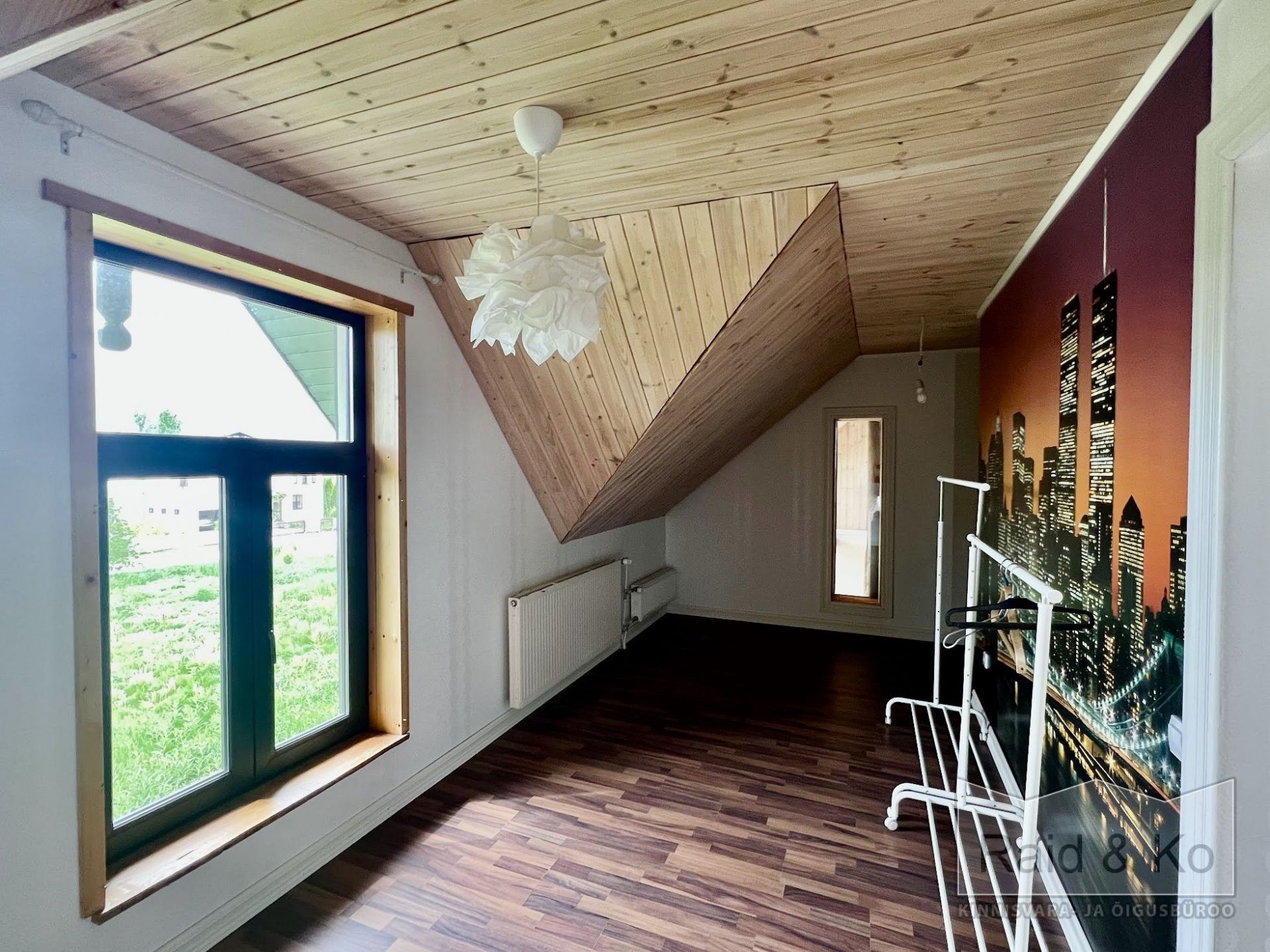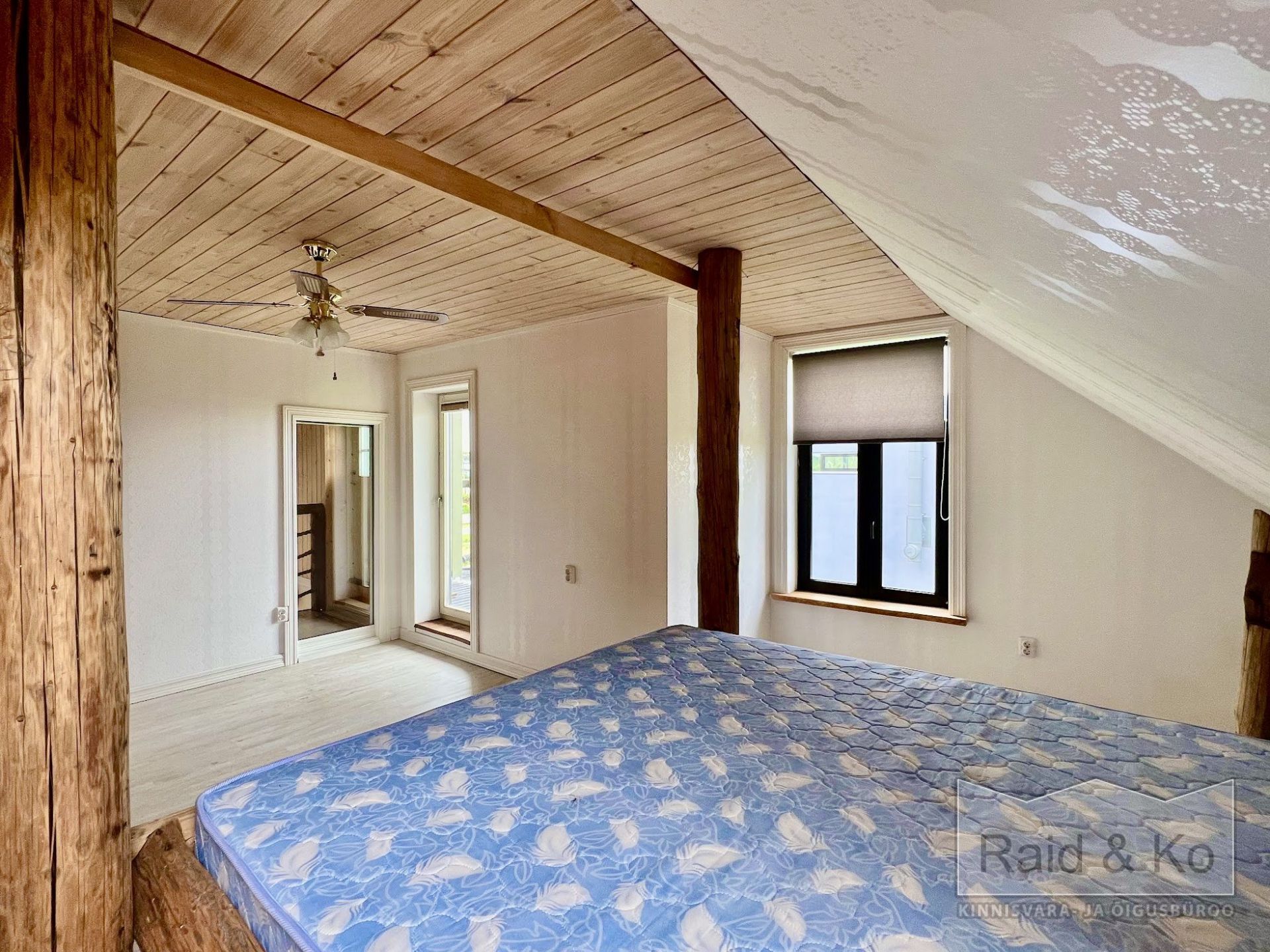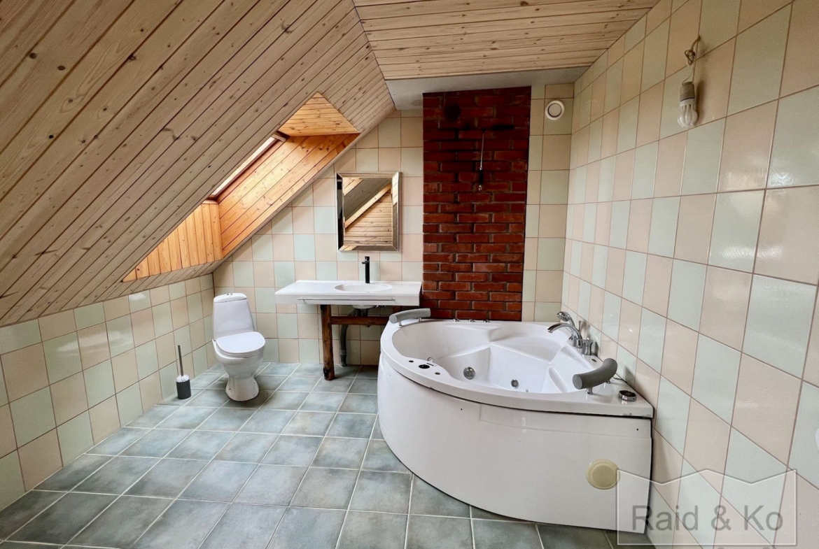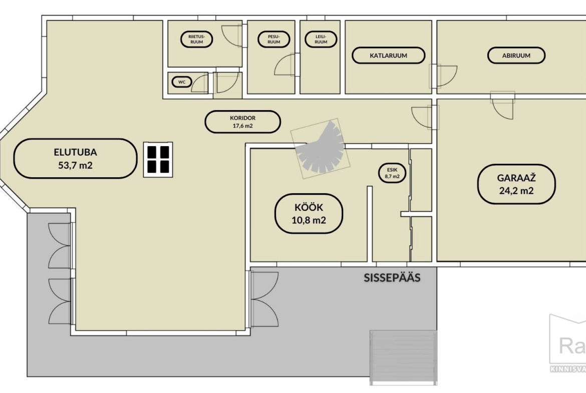 Esimesel korrusel on läbi kahe korruse ulatuv elutuba, köök, puuküttega saun, WC/ vannituba, garaaž, katlaruum ja puukuur. Elutoas on soojustsalvestav kamin-ahi.