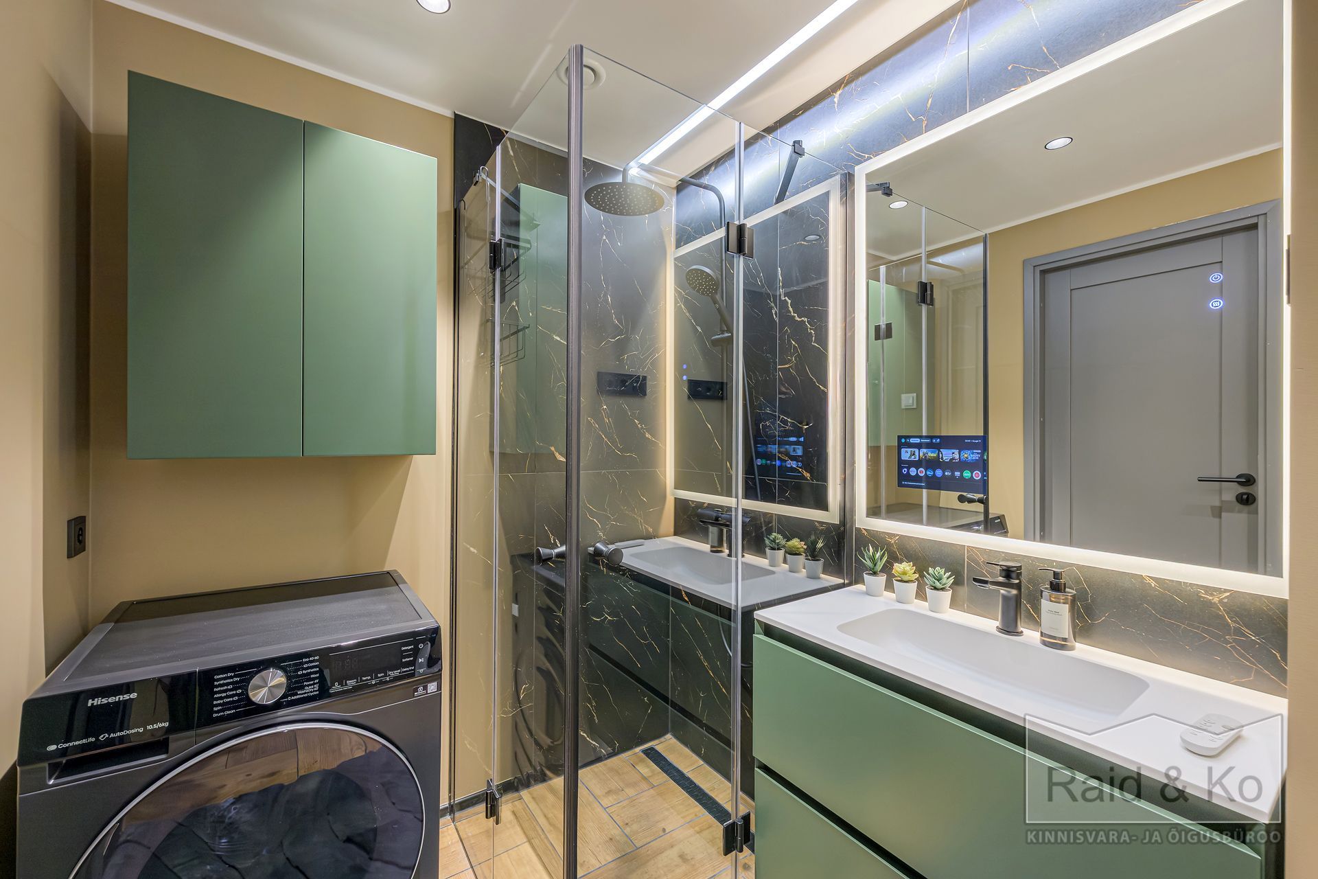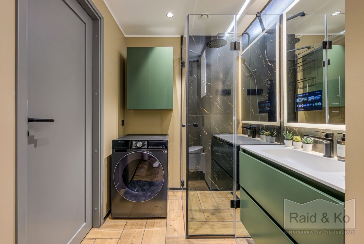 Vannitoas uus kuivatiga pesumasin. Dušš on mitmete võimalustega.