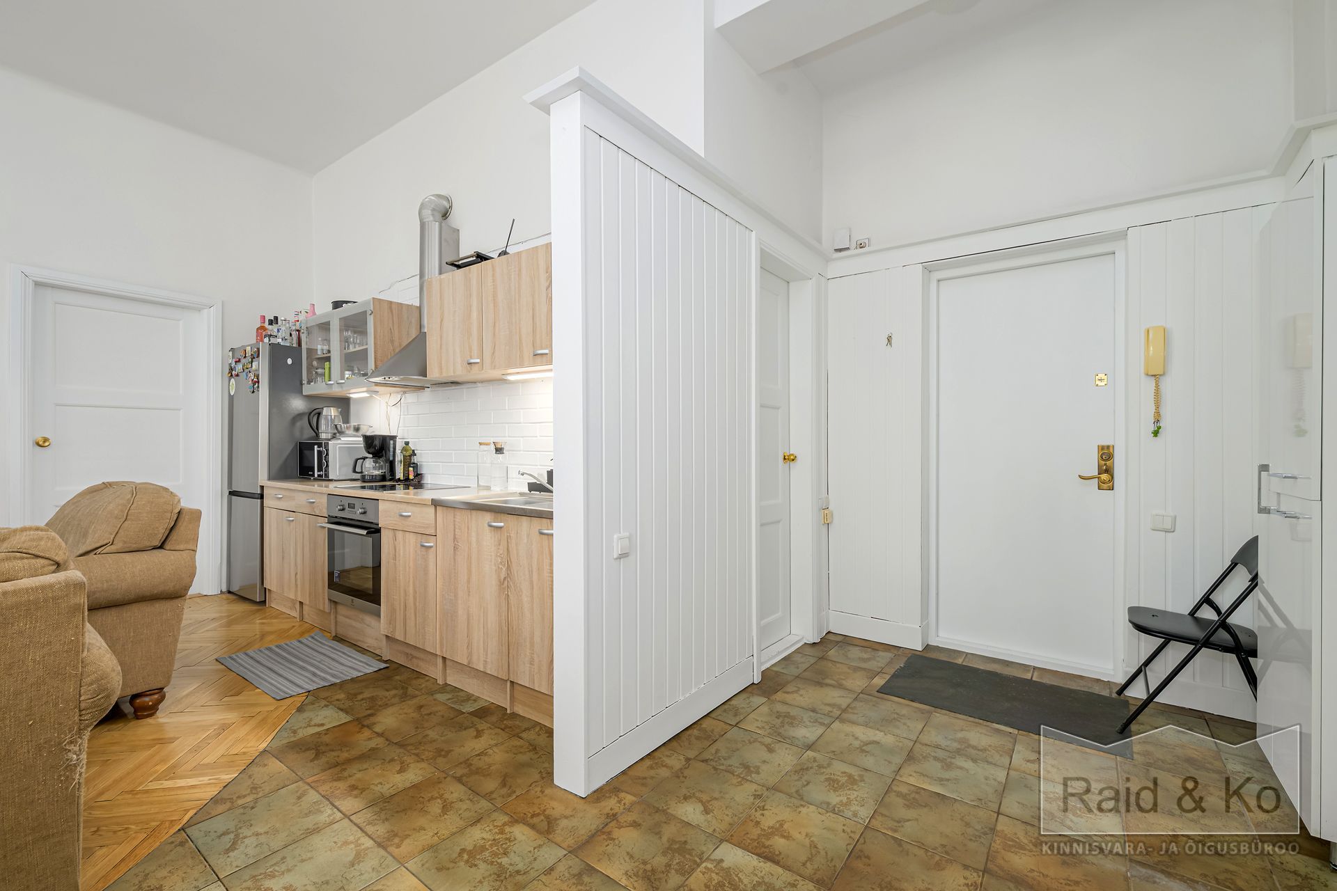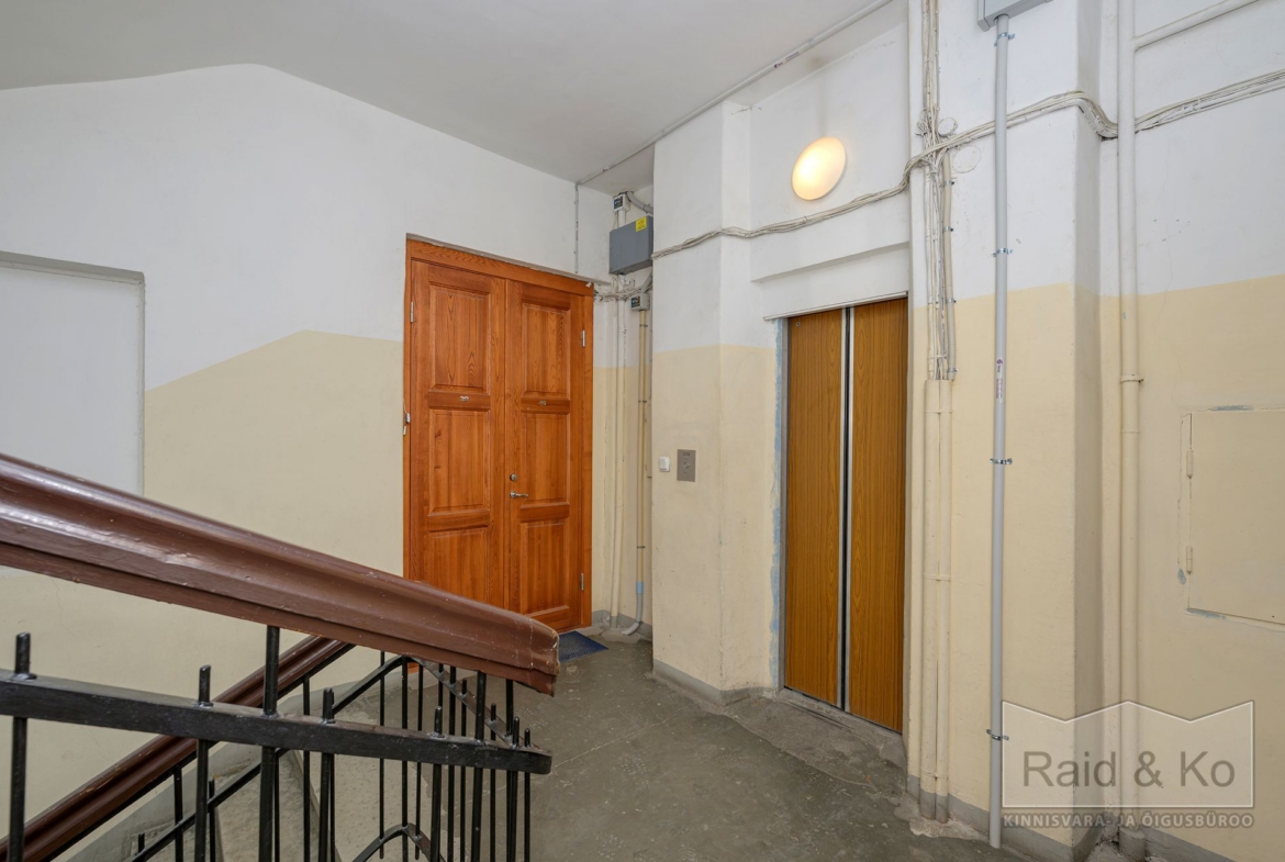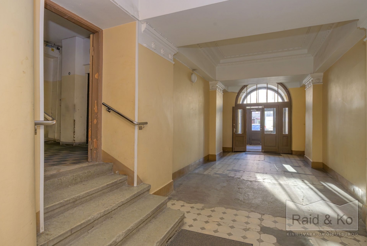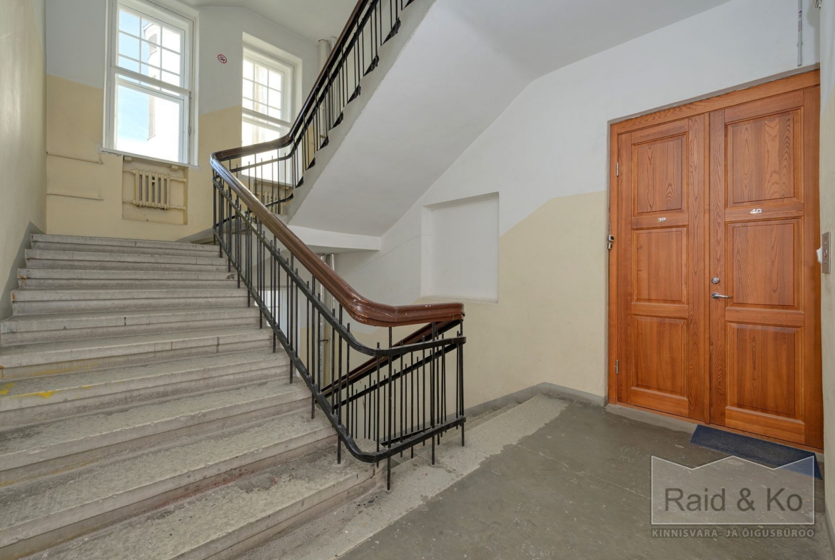 Korter paikneb esindusliku hoone neljandal korrusel kuhu pääseb nii liftiga kui ka trepist. Korterit eraldab trepikojast kauni puituksega avar lisakoridor kust on pääs kahte korterisse.