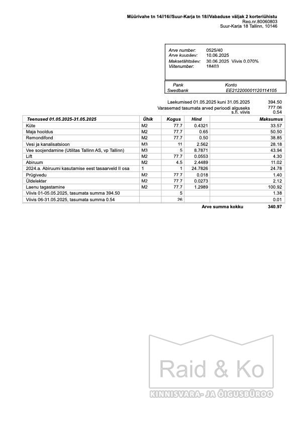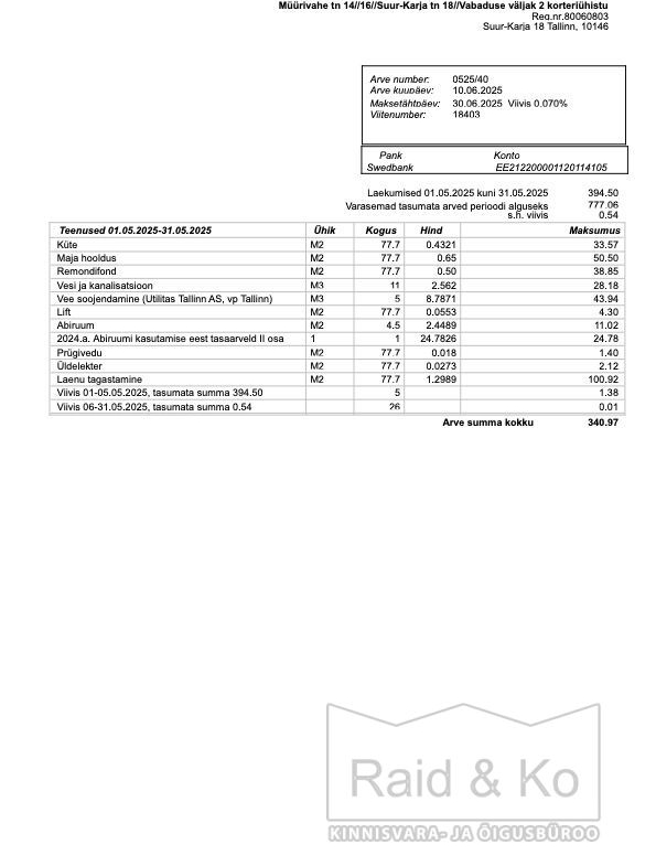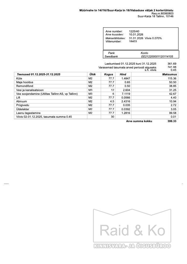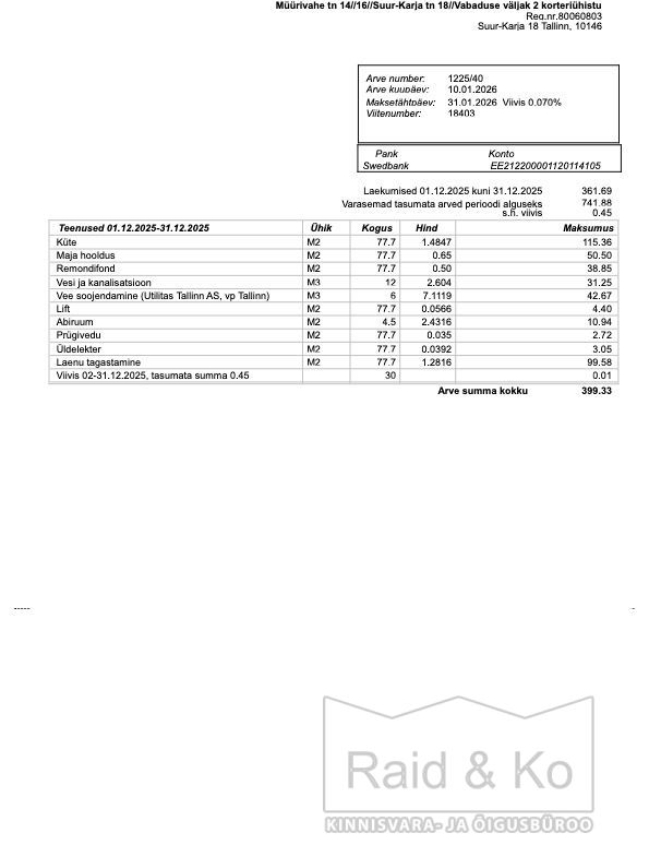 Kommunaalarve detsembri eest oli 299 eurot, maikuu eest 240 eurot. kommunaalarvetele lisandub igakuiselt laenu tagasimakse ca 100 eurot