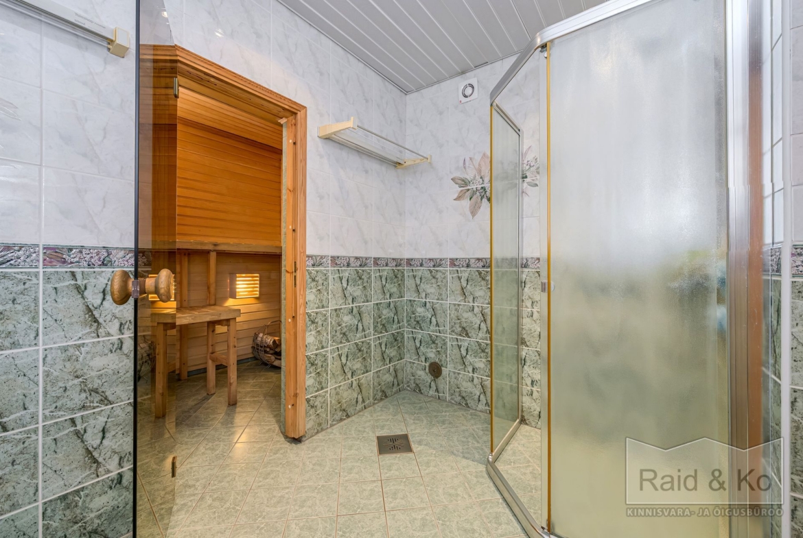 I korrusel on kõrge laega elutuba, köök-söögituba, kaminaruum, puuküttega saun, duširuum, WC ja majandusköök.