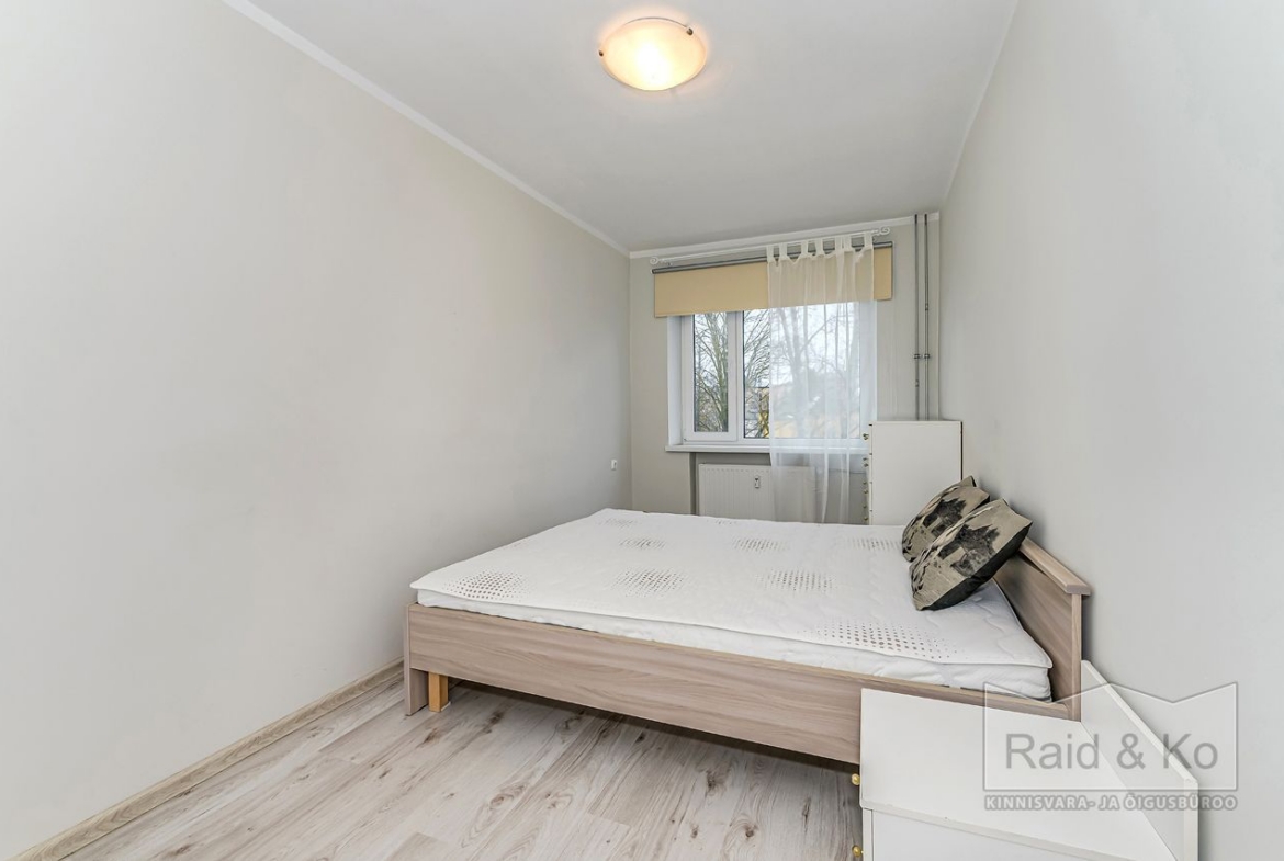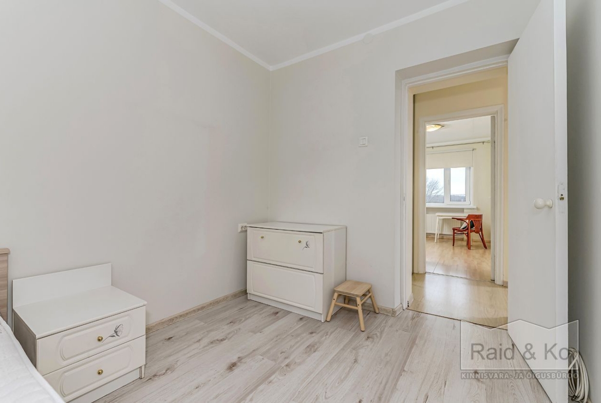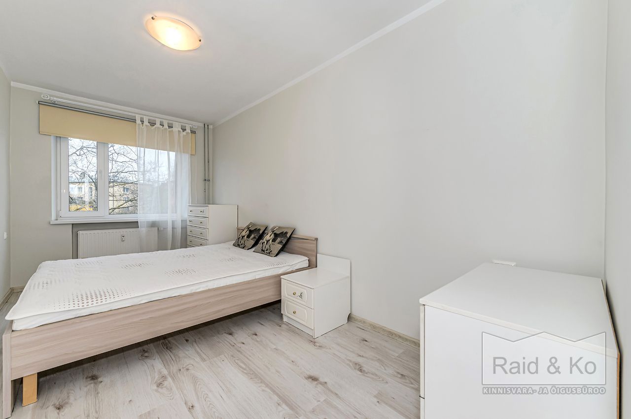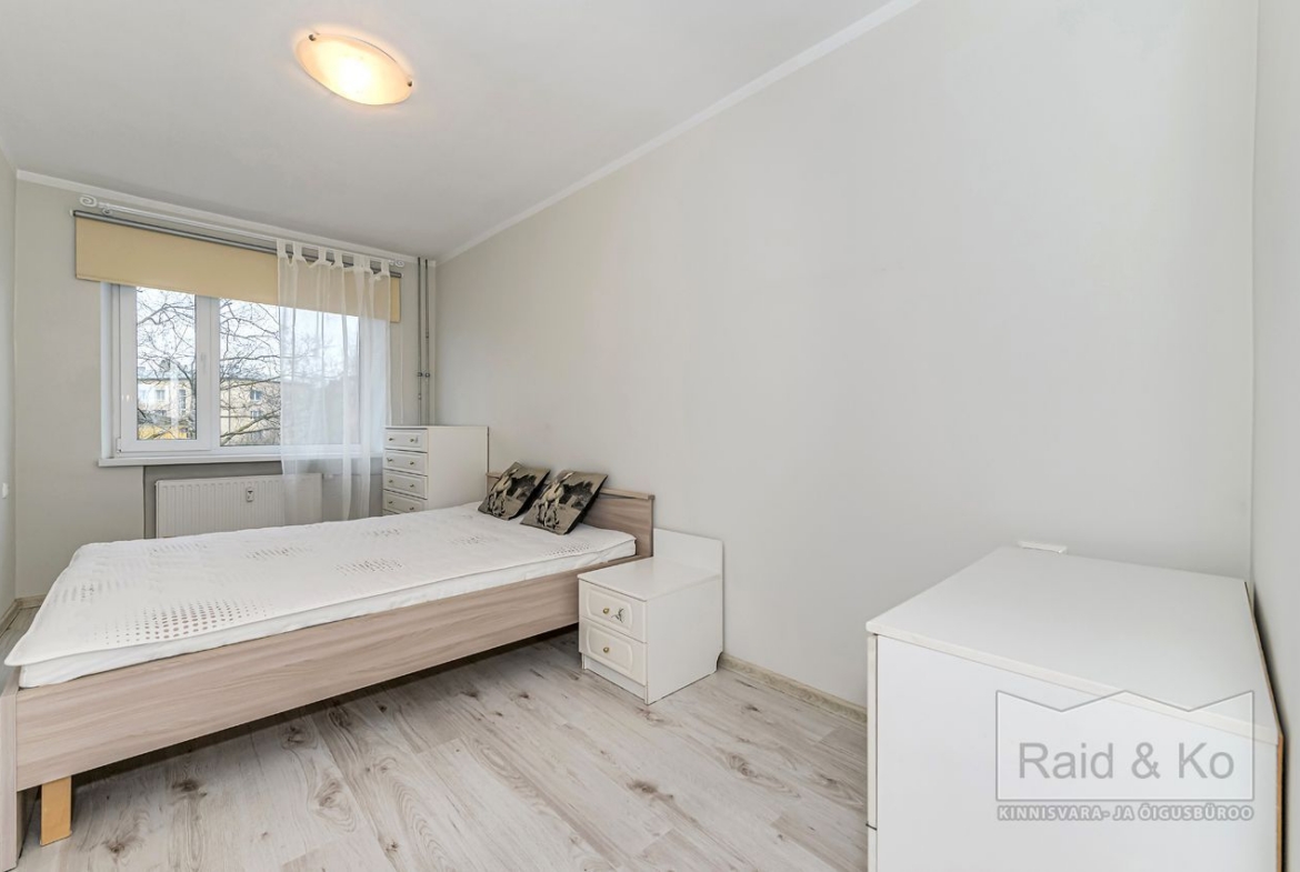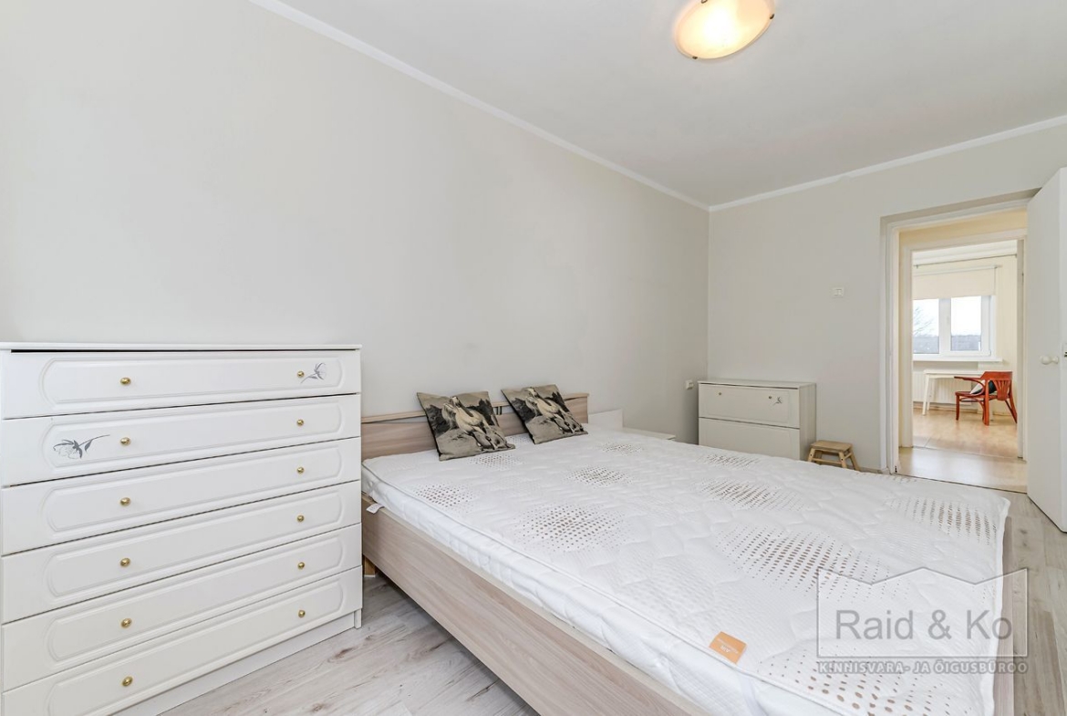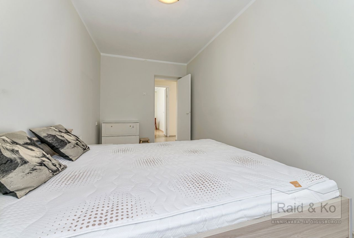 Tubade vahele on ehitatud mahukas garderoob. Magamistubades on pimendavad rulookardinad. Põrandatel on laminaatparkett, seinad on värvitud neutraalsetes toonides.