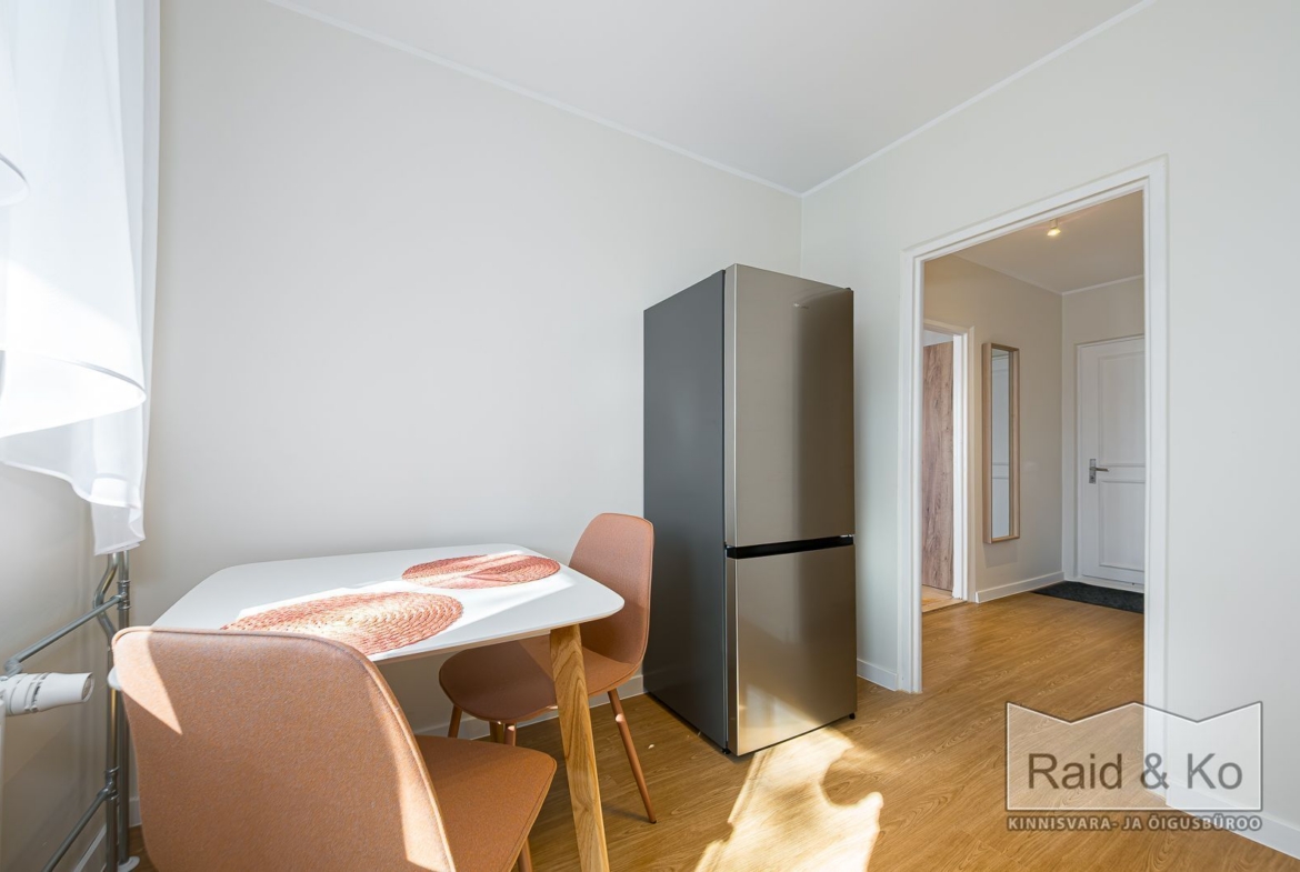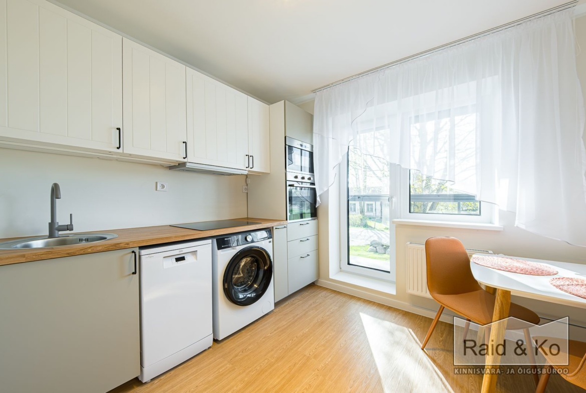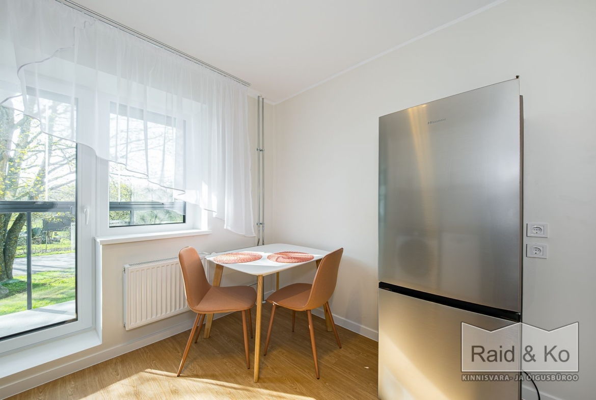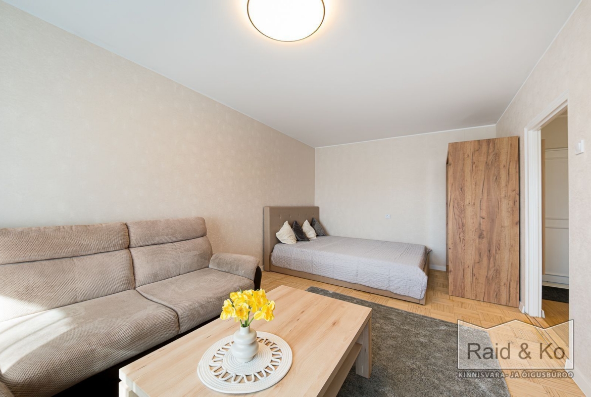 Üürile anda hubane remonditud 1-toaline korter suure rõduga, Korterisse jääb sisse piltidel olev mööbel ja tehnika.