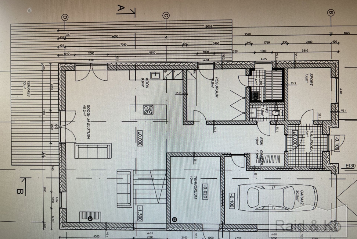 Söögi- ja elutoast pääseb suurele (50 m2) päikesepoolsele terrassile, mis ulatub maja kahele küljele.