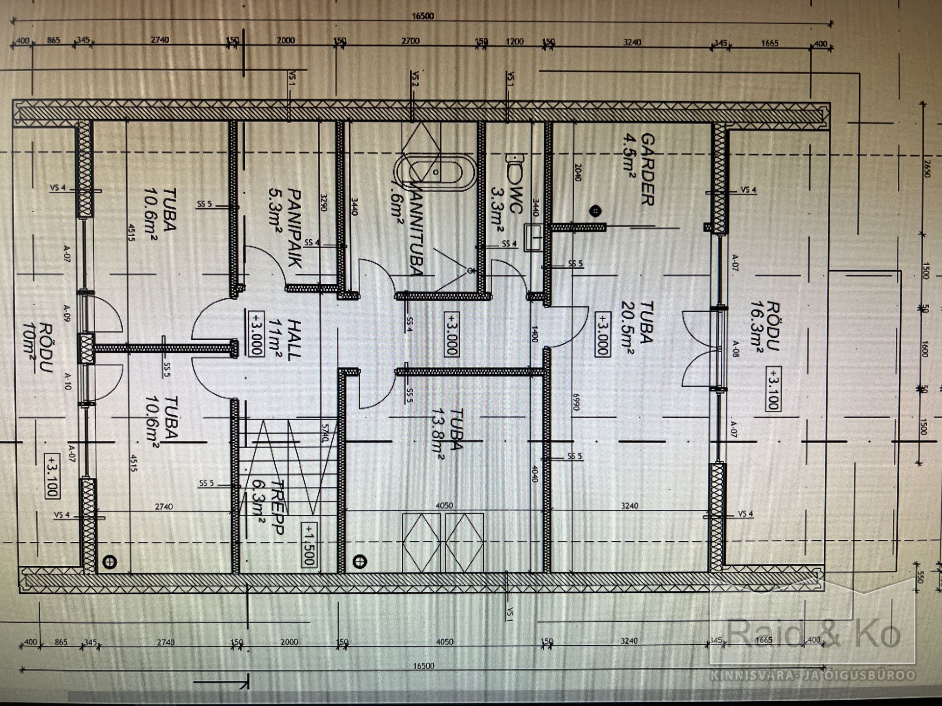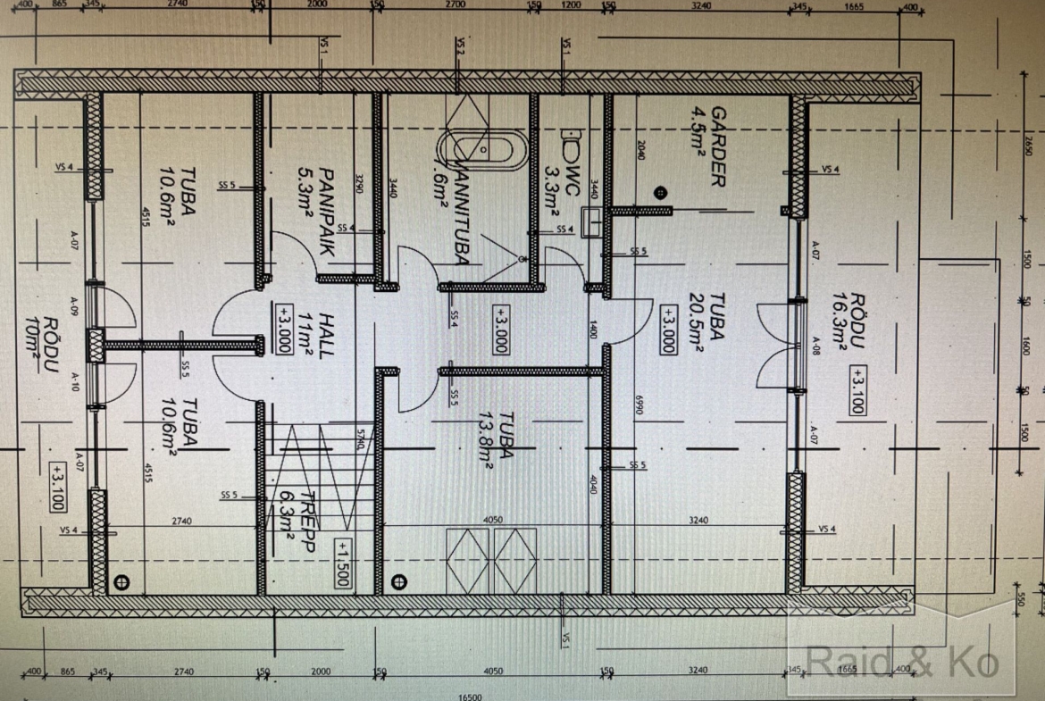 Teisele korrusele jäävad veel hall (11 m2), vannituba (7,6 m2), panipaik (5,3 m2) ja WC (3,3 m2).